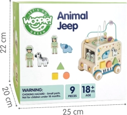 Odkryj pełen zabawy świat z drewnianą aktywną kostką w kształcie samochodu safari od marki WOOPIE GREEN. Ta multifunkcyjna zabawka łączy w sobie labirynt motoryczny, sortowanie kształtów, obrotowe zębatki oraz obrazkowe klocki, wspierając motorykę małą, koordynację i kreatywną zabawę dzieci od 18 miesięcy.