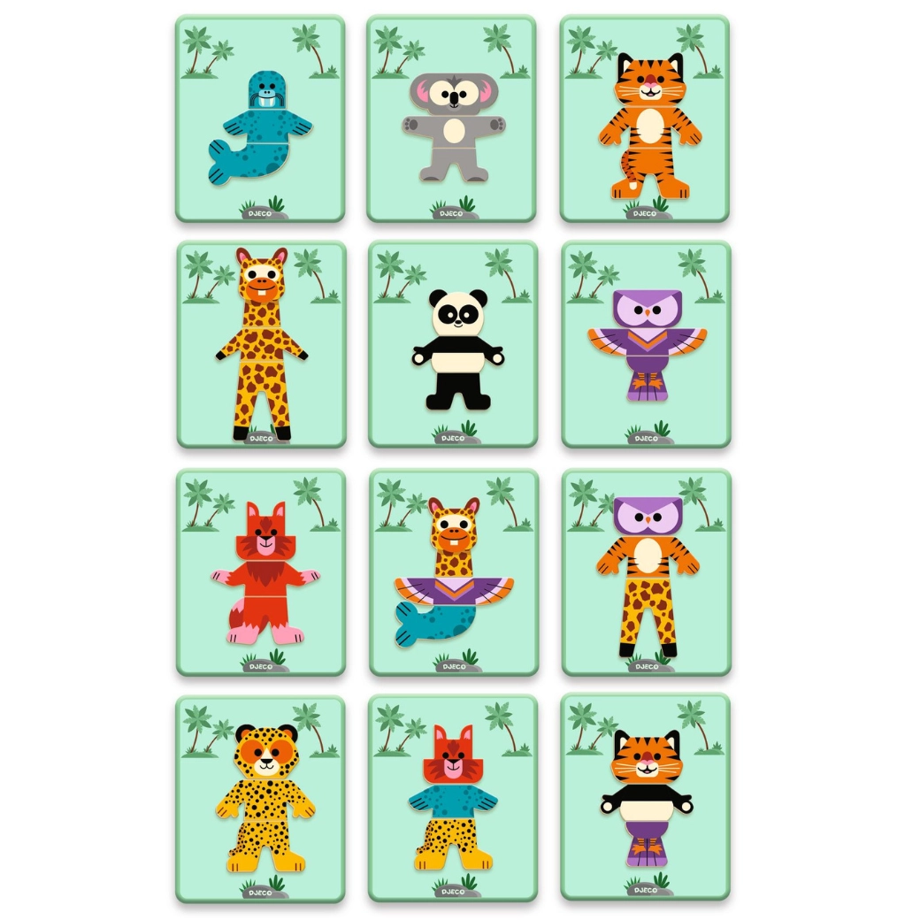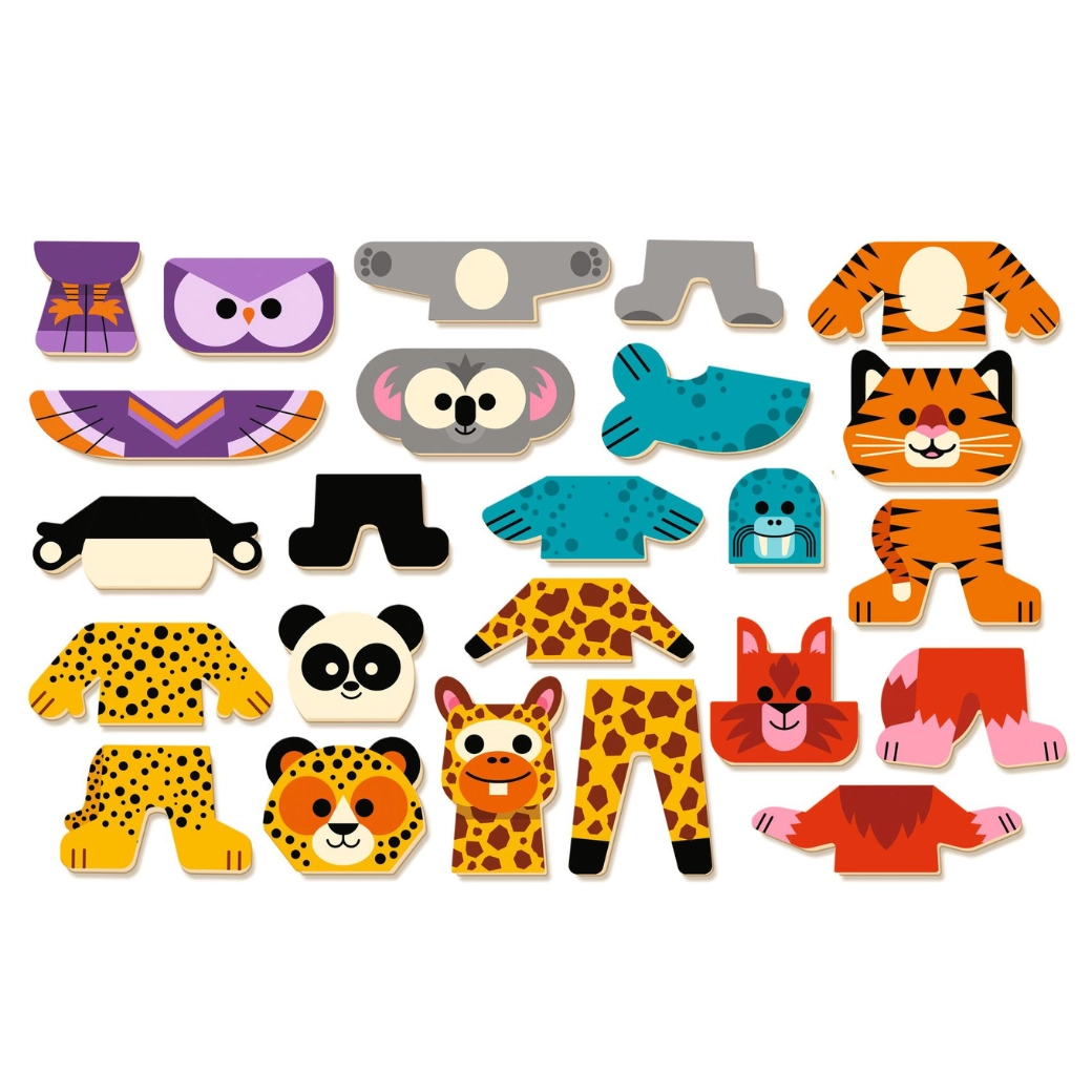 Djeco Inzebox Mix and Match to oryginalna magnetyczna układanka, która pozwala dzieciom łączyć głowy, tułowia i nóżki różnych zwierząt. Z jednego zestawu powstają dziesiątki wesołych kombinacji – od geparda po uroczą pandę. Zabawa wspiera kreatywność, koordynację ręka–oko oraz małą motorykę.