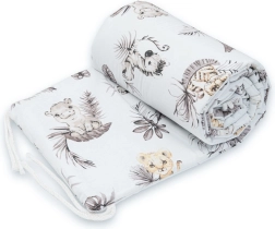 Miękki ochraniacz do łóżeczka NEW BABY z motywem Safari chroni maluszka przed przeciągiem i uderzeniami. Wykonany z 100% bawełny z antyalergicznym wypełnieniem poliestrowym, łatwo mocowany do łóżeczka za pomocą sznureczków. Wymiary ok. 180 × 32 cm.