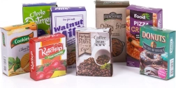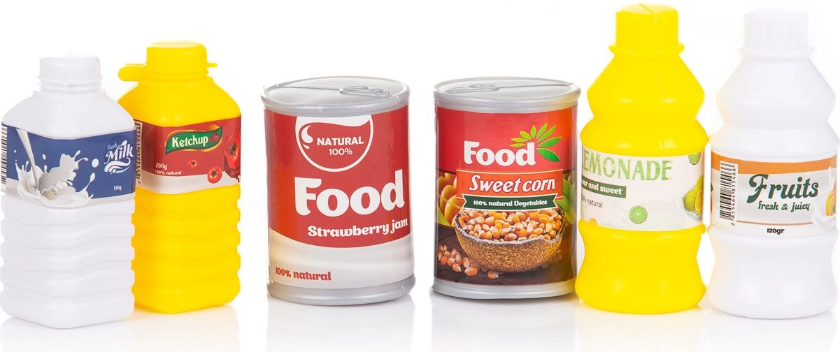 Papierowe pudełka z żywnością oraz dziecięce butelki i puszki dodają zabawie autentyczności – idealne do układania list zakupów i sortowania produktów.