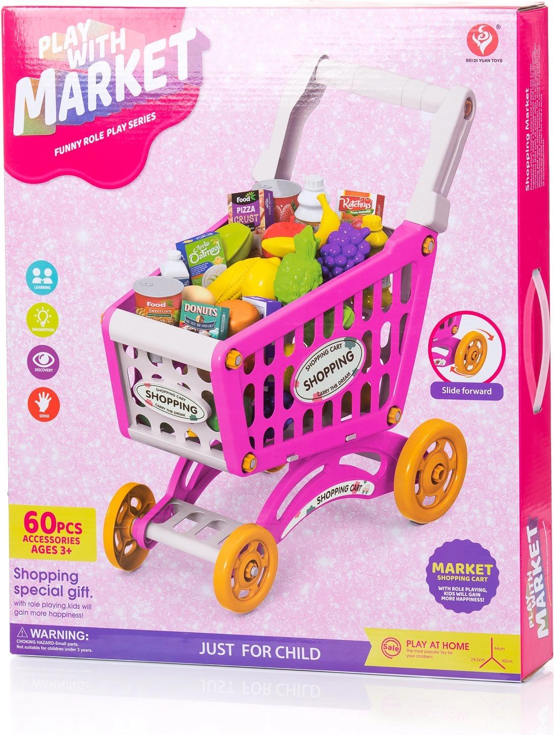Lekki plastikowy wózek z wygodnym uchwytem i skrętnymi kółkami jest idealny dla małych rączek. Otwarty koszyk z łatwością pomieści wszystkie dziecięce zakupy.