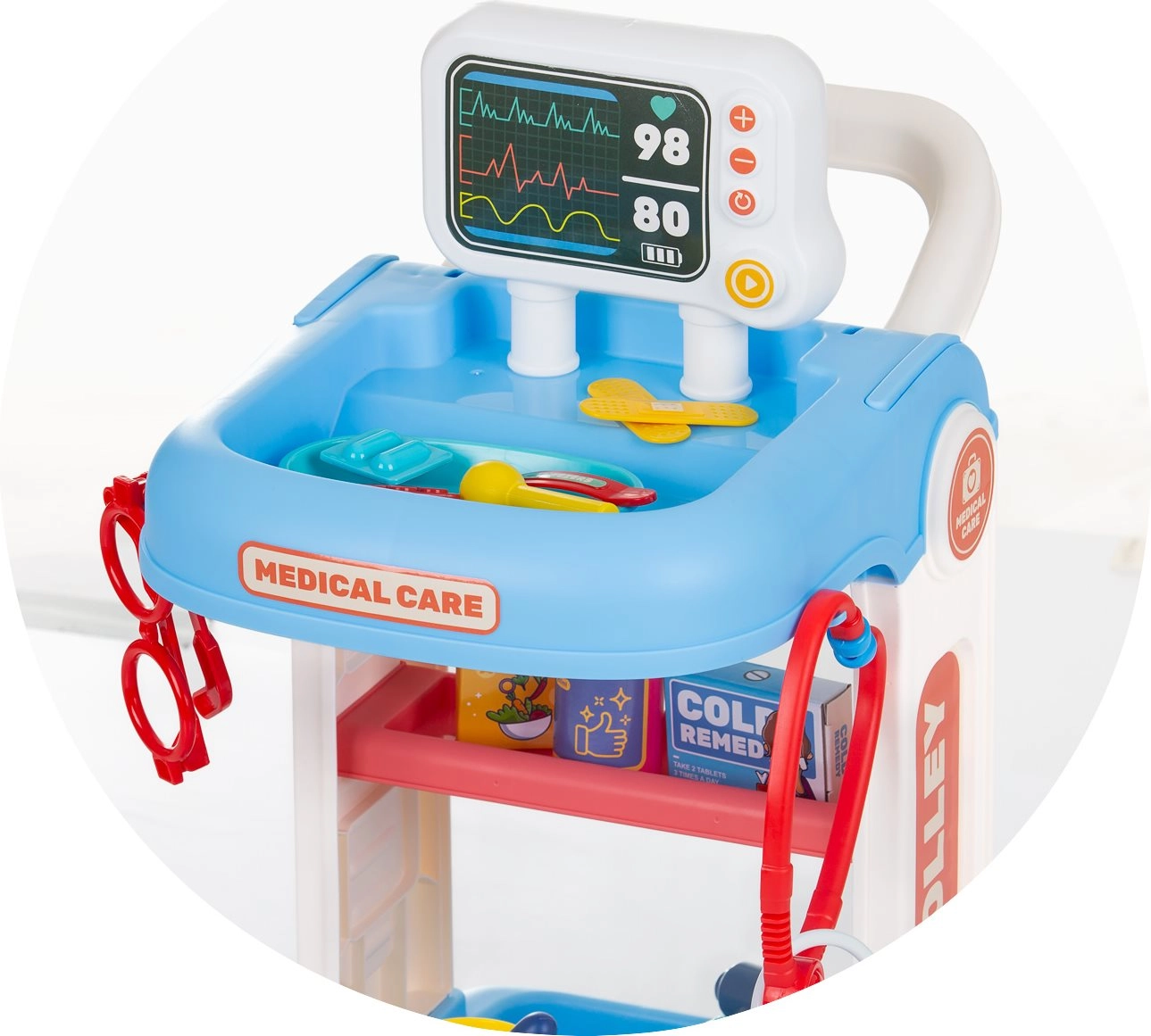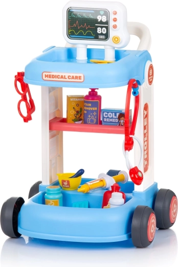 Ten dziecięcy zestaw lekarski z mobilnym wózkiem oferuje wszystko, czego mały doktor potrzebuje do swoich pierwszych badań. Stabilna konstrukcja z kółkami i uchwytem ułatwia przemieszczanie po pokoju, a półki i przegródki utrzymują wszystkie narzędzia pod ręką i w porządku. Dzięki bogatemu wyposażeniu dzieci mogą wypróbować podstawowe czynności lekarskie oraz ćwiczyć empatię i umiejętności komunikacyjne.