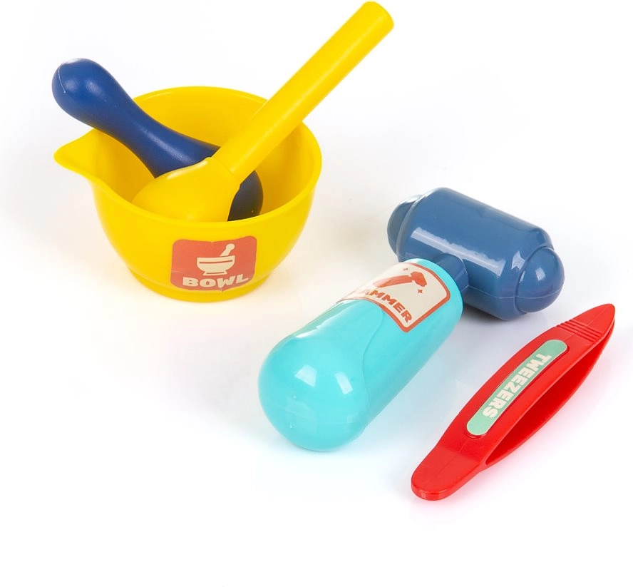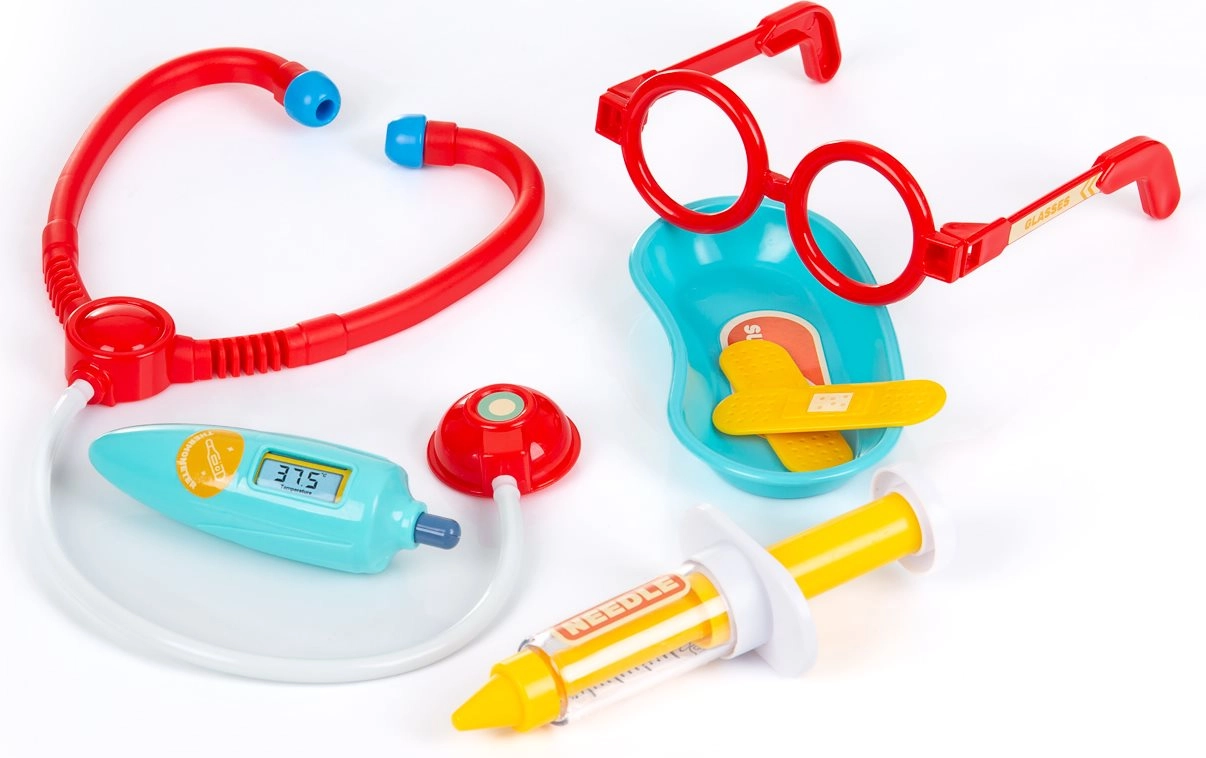 Stetoskop, termometr, strzykawka, nożyczki i inne dodatki inspirują dzieci do pomysłowej zabawy i nauki podstawowych czynności z medycznego otoczenia.