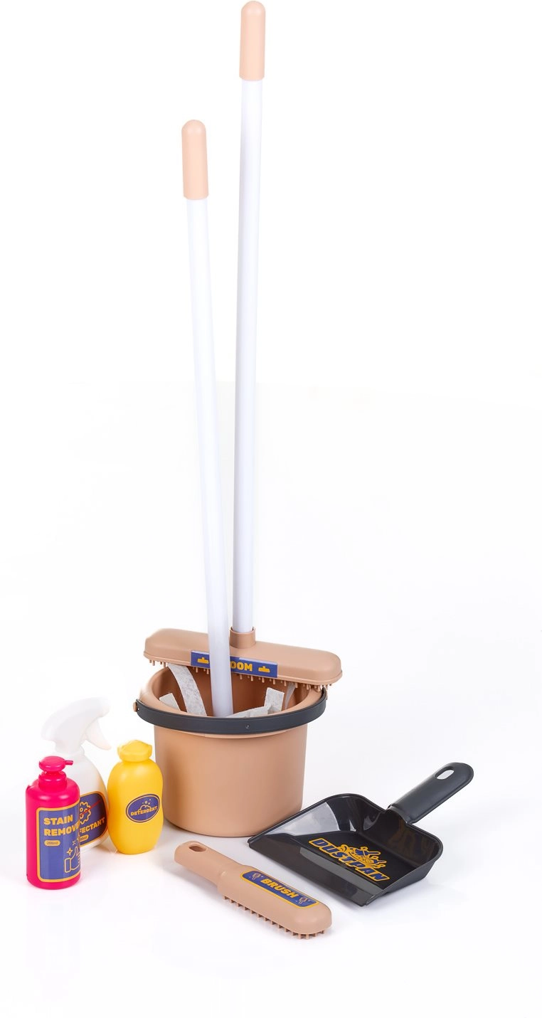 - Pełne wyposażenie: wiadro z wyciskaczem, miotła/mop, zmiotka i szufelka, szczotka, spryskiwacze i buteleczki na „środki czyszczące”.