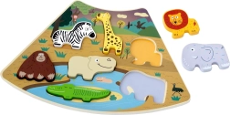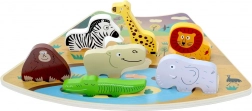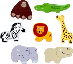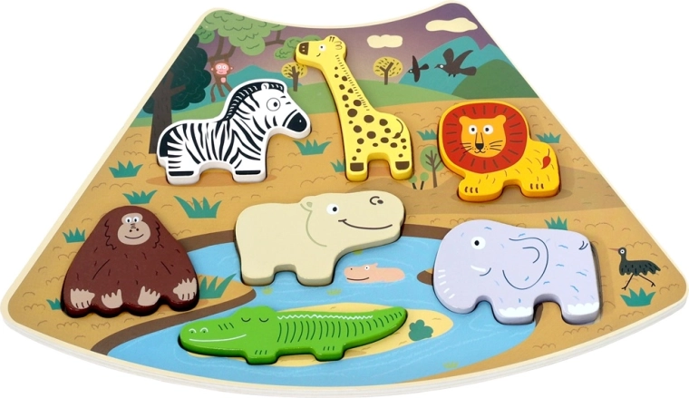 Drewniane puzzle Safari to idealna zabawka na pierwsze układanie. Kolorowe i urocze figurki zwierząt – zebra, żyrafa, lew, goryl/orangutan, hipopotam, słoń i krokodyl – mają grube, łatwe do chwytania kształty, które ułatwiają dzieciom manipulację. Podkładka ze scenerią sawanny wspiera percepcję przestrzenną i rozpoznawanie kształtów, ponieważ każdy element ma swoje dokładne miejsce.