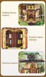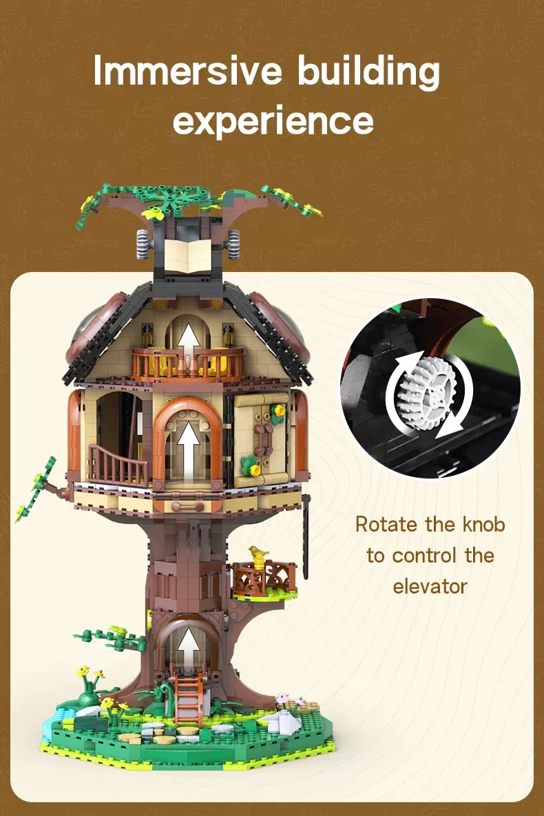 Model zachwyca bogatym wyposażeniem i funkcjami: winda sterowana obrotowym pokrętłem na szczycie drzewa, składane okiennice, otwierane części umożliwiające zajrzenie do środka oraz oświetlenie LED na USB, które podkreśla detale podczas ekspozycji. Zestaw świetnie rozwija cierpliwość i kreatywność, a jednocześnie stanowi piękną dekorację wnętrza.