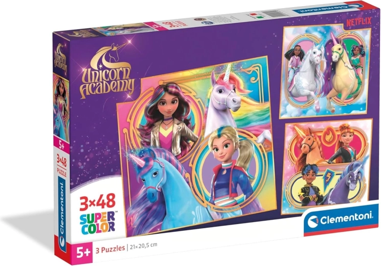 Urocze puzzle dla dzieci z motywem Akademii Jednorożców ucieszą każdego małego miłośnika baśni. Zestaw zawiera 3 układanki po 48 elementów, każda po ułożeniu ma wymiary około 21 × 20,5 cm. Wysokiej jakości nadruk, nasycone kolory i solidne elementy wspierają cierpliwość, koncentrację i motorykę.