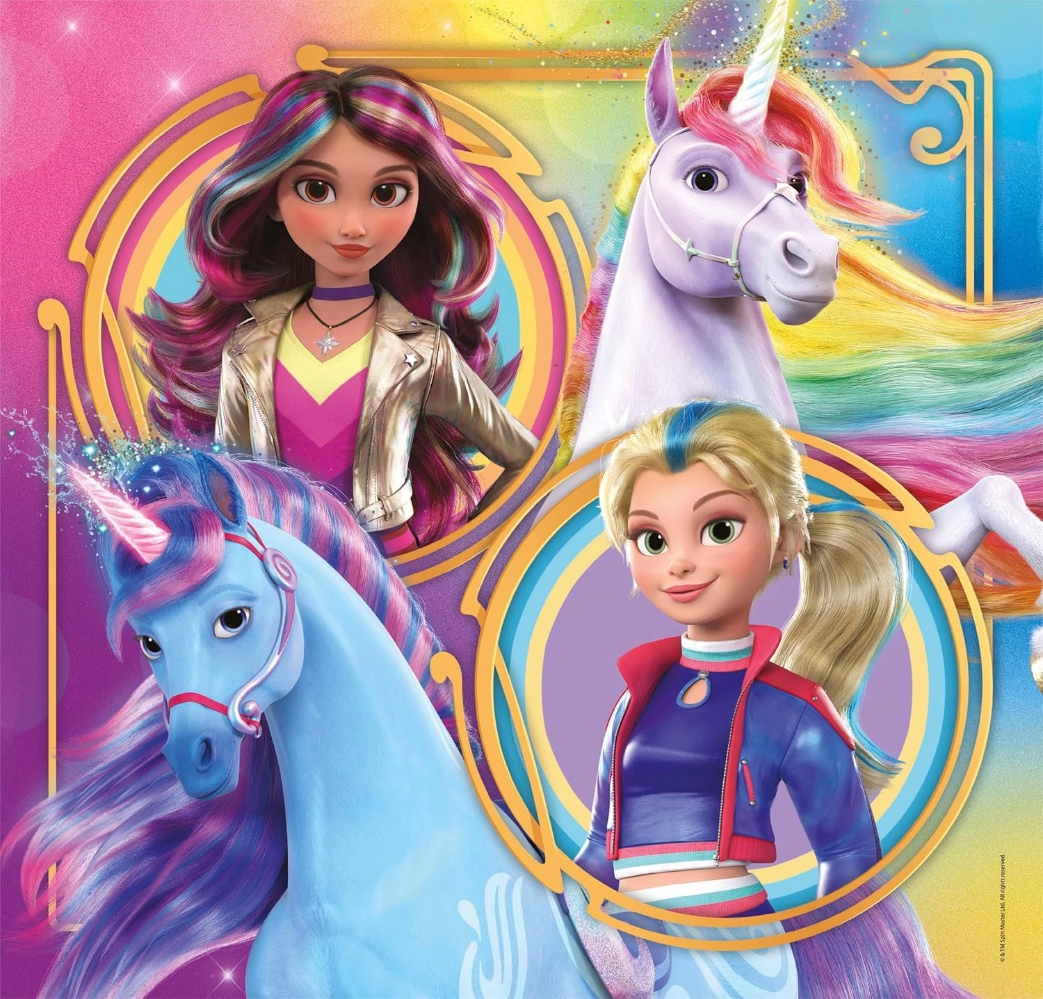 Odkryj świat magicznych jednorożców z pięknym zestawem trzech puzzli, idealnych dla dzieci. Każde puzzle ma 48 elementów i po ułożeniu osiąga wymiary około 21 × 20,5 cm. Dzięki wytrzymałej kartonowej konstrukcji elementy wygodnie się składają i dobrze do siebie pasują.