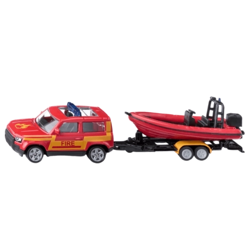 - Strażacki Land Rover Defender z przyczepą i łodzią motorową