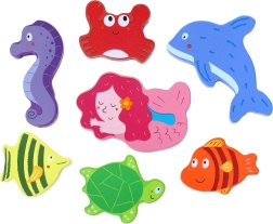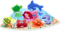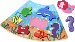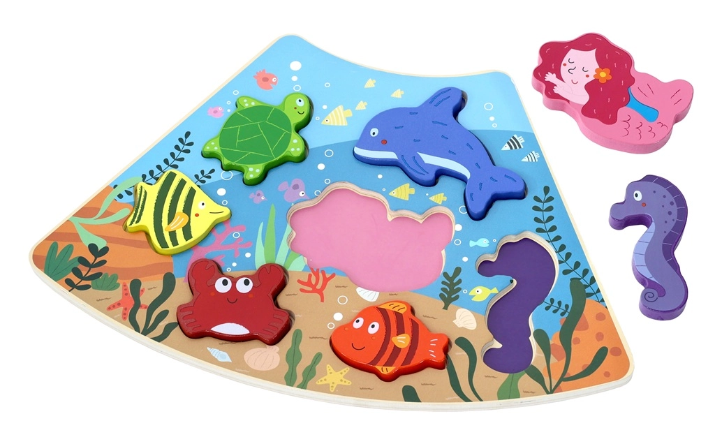 Odkryj magię oceanu z solidną drewnianą podstawką i 7 różnymi elementami – żółw, delfin, syrena, konik morski, krab i inne rybki. Dzięki grubym i gładkim elementom puzzle świetnie leżą w dłoni nawet najmłodszym dzieciom i pomagają trenować percepcję kształtów oraz cierpliwość.
