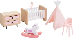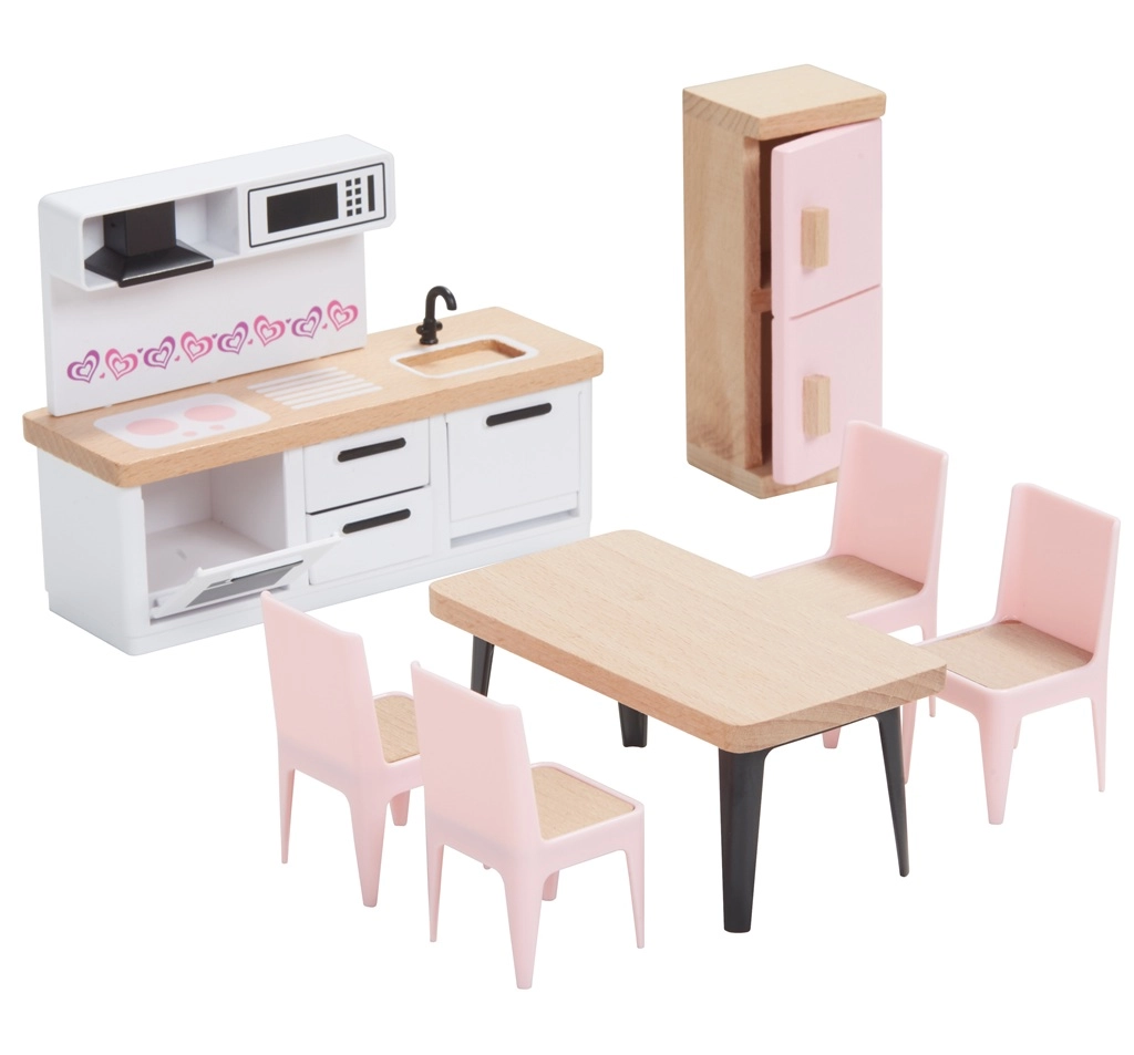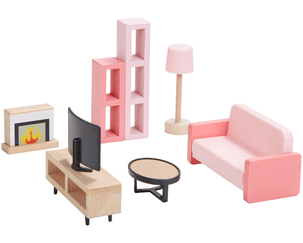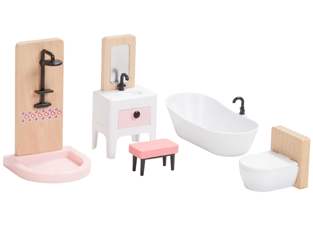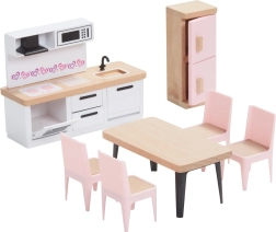 Ten uniwersalny zestaw mebli do domku oferuje wszystko, czego dzieci potrzebują, aby stworzyć przytulny dom dla swoich figurek. Zawiera wyposażenie sypialni, kuchni, salonu, łazienki i pokoju dziecięcego w harmonijnym połączeniu naturalnego drewna i subtelnych różowych akcentów. Nie brakuje także całej rodzinki z ruchomymi kończynami do autentycznych scenek i zabawy w odgrywanie ról.