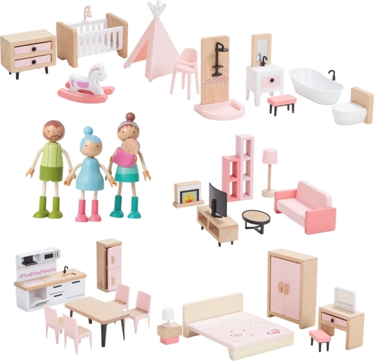 Kompletny drewniany zestaw mebli 5 w 1 do domku dla lalek obejmuje sypialnię, kuchnię, salon, łazienkę oraz pokój dziecięcy, w tym rodzinkę figurek. Zestaw 36 elementów z delikatnymi pastelowymi detalami wspiera kreatywną i wyobrażeniową zabawę, ćwiczy motorykę małą oraz umiejętności komunikacyjne. Idealny jako pierwsze kompletne wyposażenie do domku.