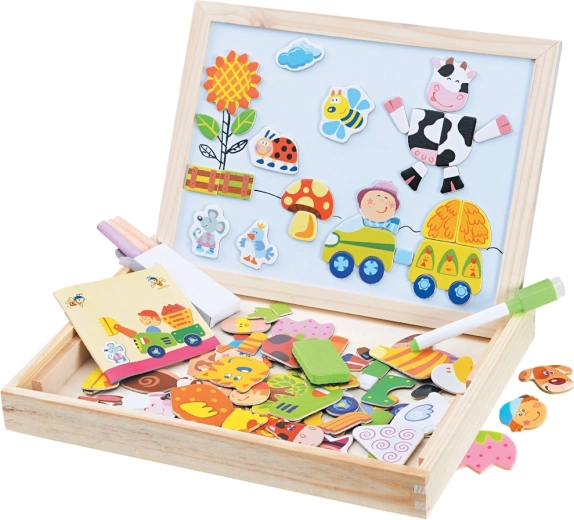 Odkryj urok wsi z kreatywnym zestawem dla małych twórców! Ta dwustronna magnetyczna tablica oferuje pisanie markerem po białej stronie oraz rysowanie kredą po łupkowej stronie. Dzieci mogą przypinać kolorowe magnesy z motywami farmy, układać opowieści, uczyć się kształtów i kolorów oraz rozwijać motorykę małą i wyobraźnię. Wszystko przechowywane jest w praktycznym drewnianym pudełku ułatwiającym przenoszenie.