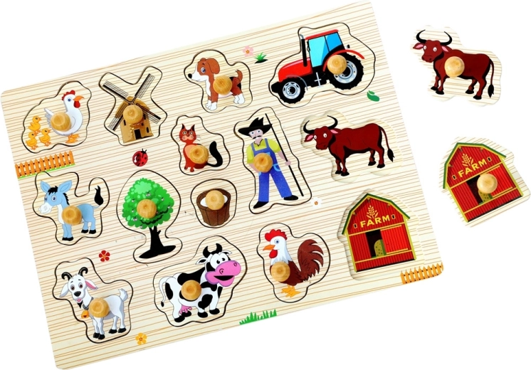 Odkryj urok wsi z drewnianą układanką wtykaną, która przybliża dzieciom świat zwierząt na farmie. Zawiera 14 łatwych do chwytania elementów z uchwytami na solidnej planszy, wspiera małą motorykę, koordynację ręka-oko oraz rozpoznawanie zwierząt i otoczenia. Trwałe drewniane wykonanie gwarantuje długą żywotność i bezpieczną zabawę od 18 miesięcy.