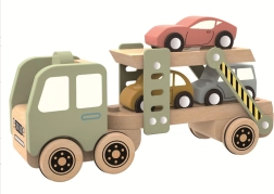 - Drewniana laweta, 3 autka, figurka kierowcy