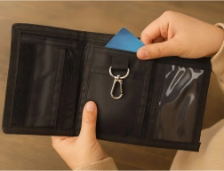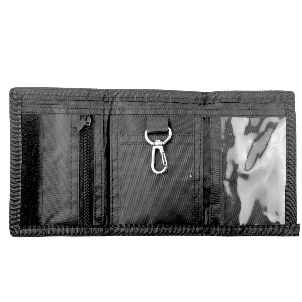 Kieszeń na monety na zamek, przegroda na banknoty, przezroczyste okienko na legitymację oraz haczyk/karabińczyk na klucze zapewniają porządek i szybki dostęp.