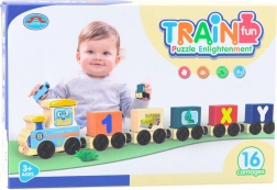 - lokomotywa; wagoniki do złożenia; klocki z cyframi; klocki z literami; dekoracyjne naklejki
