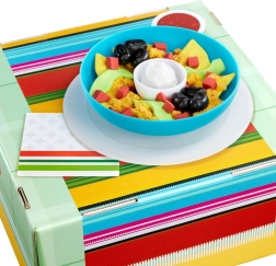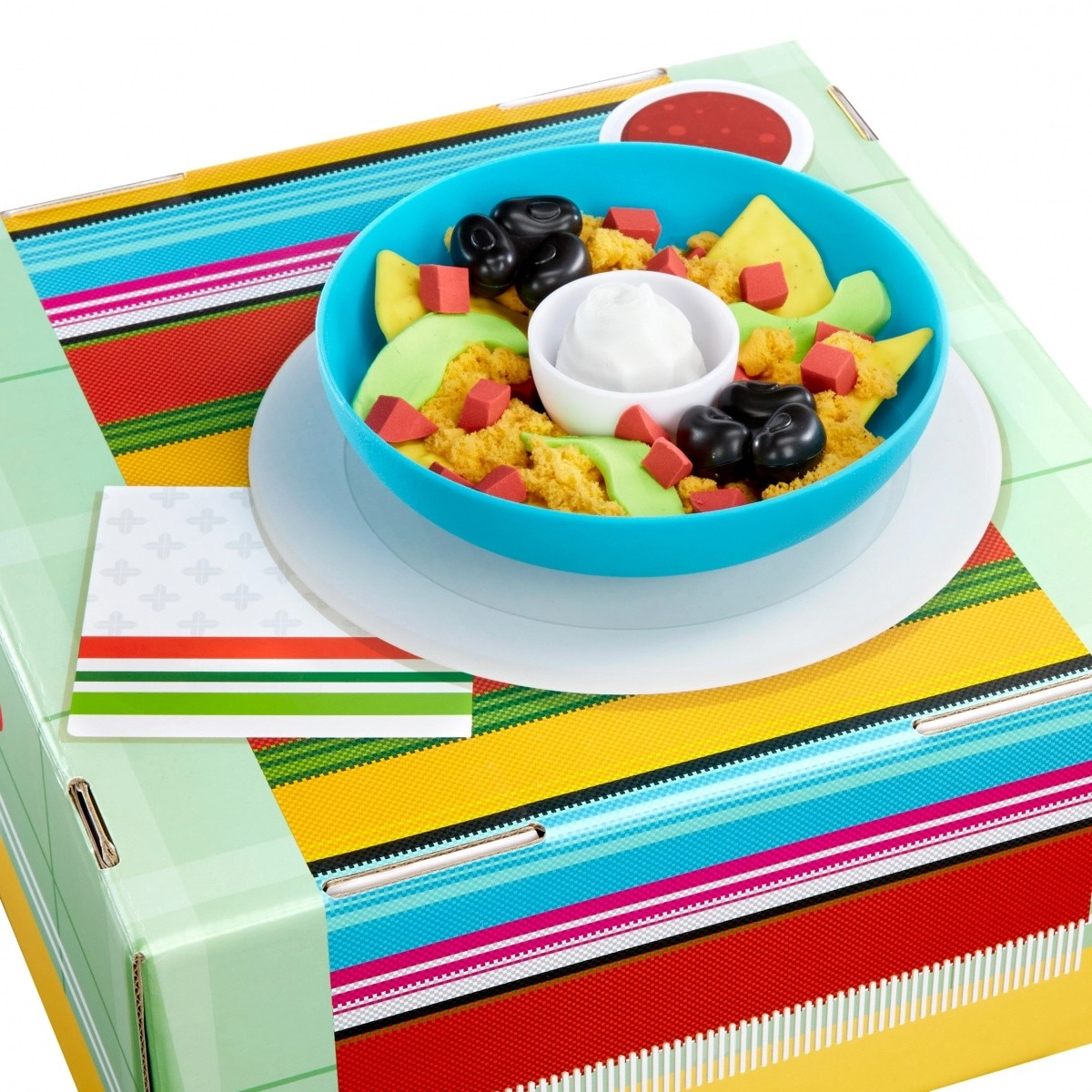 Ten kolorowy zestaw do przygotowywania „nachos” wprowadza zabawę do dziecięcej kuchni i pokoju zabaw. Zawiera miskę, talerz oraz bogaty wybór plastikowych składników – „chipsy tortilla”, awokado, pomidorki, czarną fasolę, ser oraz „kwaśną śmietanę”. Dzieci łatwo poćwiczą udawane gotowanie, serwowanie i zabawę przy stole.