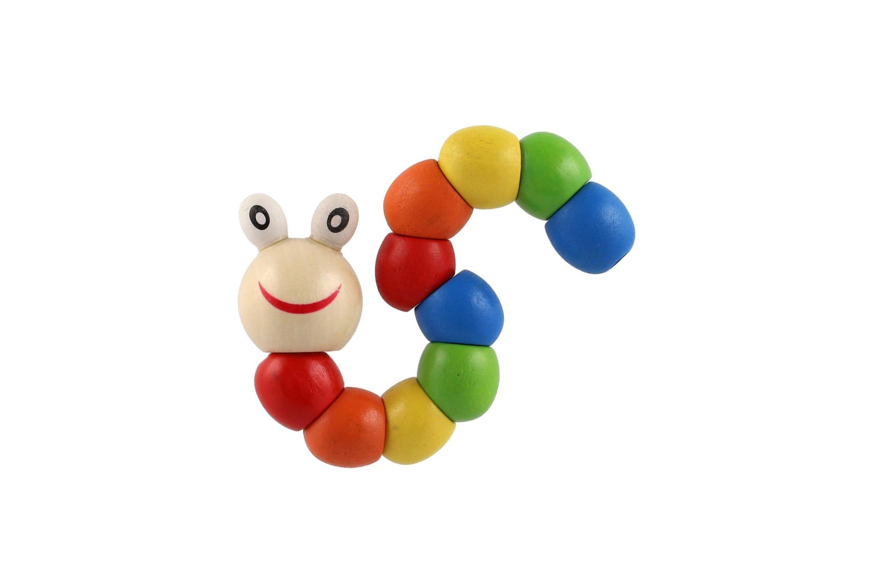 Ta kolorowa drewniana gąsienica to klasyczna zabawka manipulacyjna, która naturalnie zachęca dzieci do ćwiczenia małej motoryki, koordynacji oko–ręka oraz kreatywności. Poszczególne segmenty są połączone ukrytym przegubem, dzięki czemu zabawka płynnie się wygina, skręca i utrzymuje podstawowe kształty.