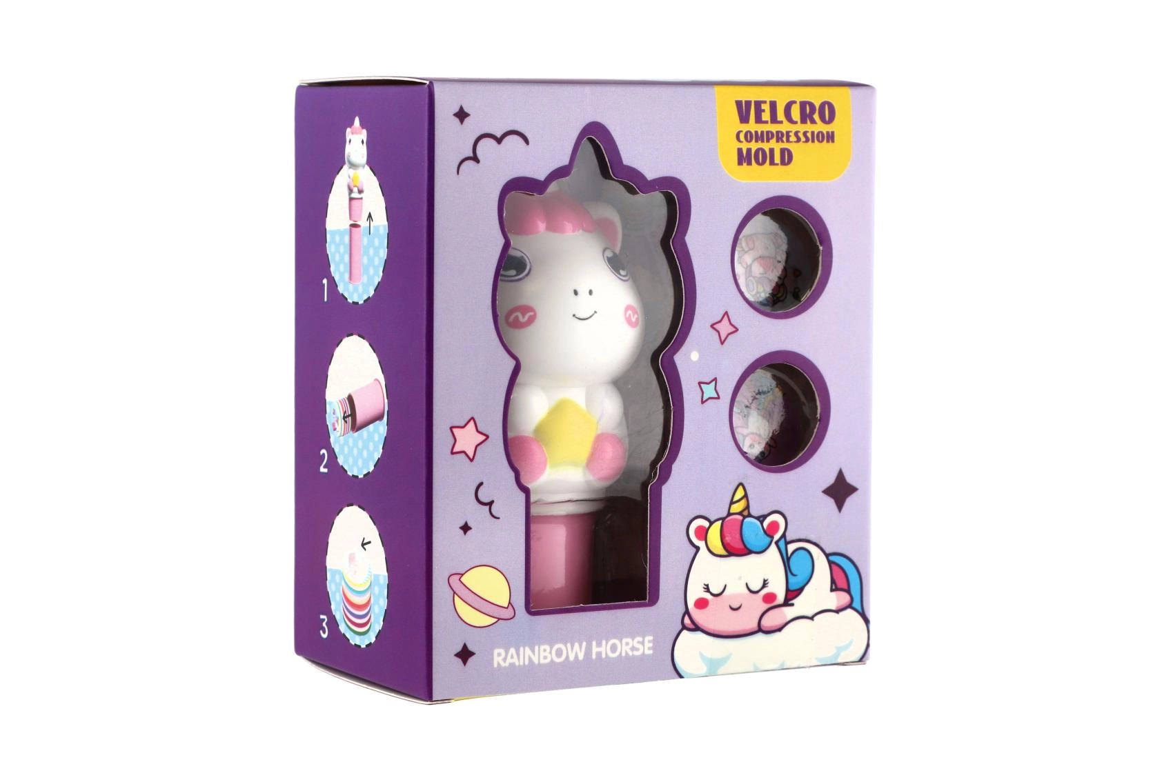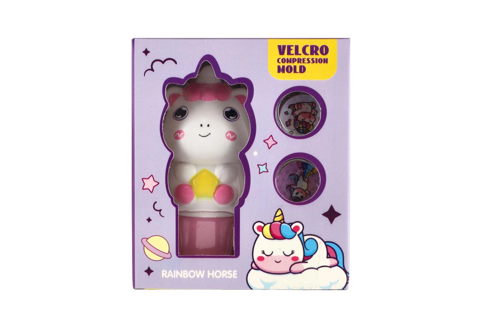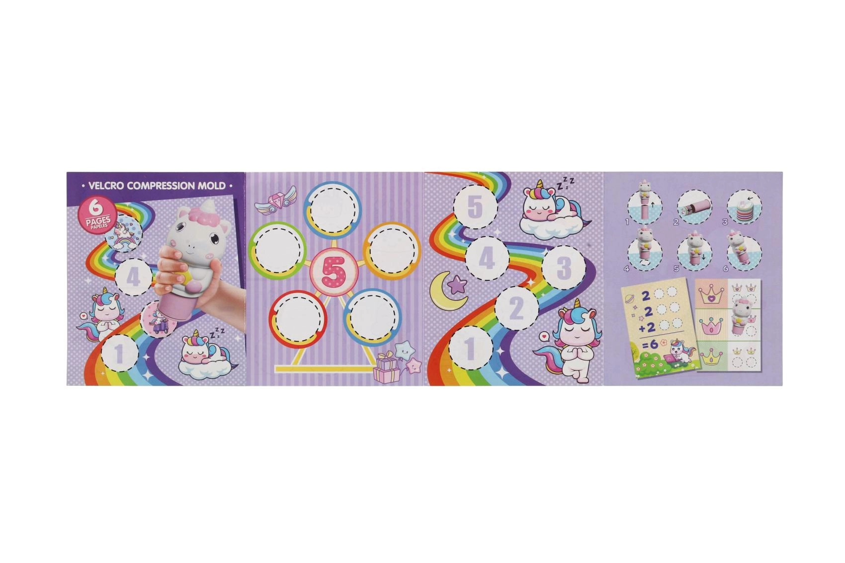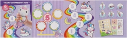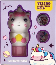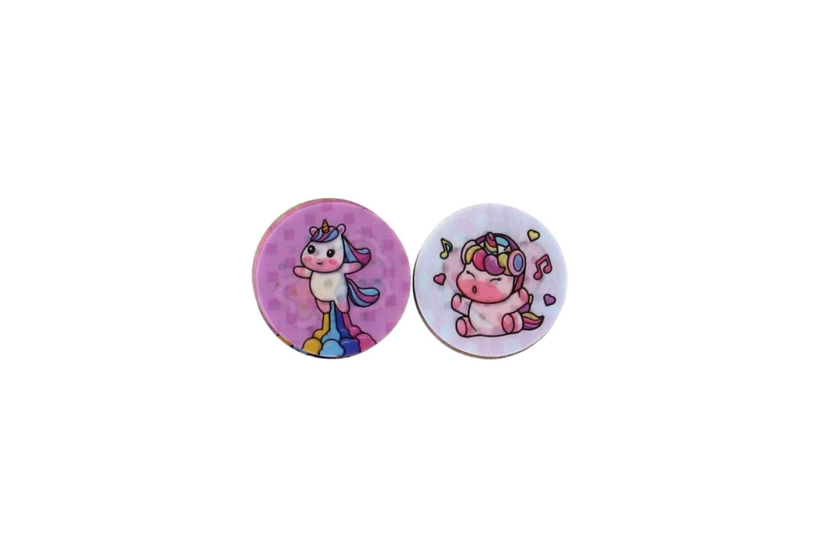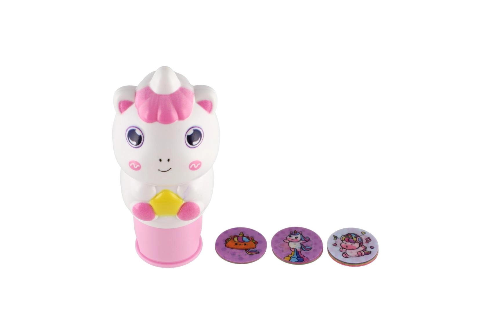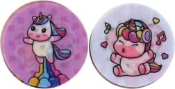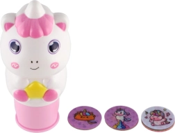 W zestawie znajdują się okrągłe dyski z różnymi obrazkami jednorożców, które łatwo wymienisz, tworząc za każdym razem nowy odcisk.