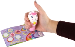 Pieczątka jest gotowa do natychmiastowego użycia. Zestaw motywów z jednorożcami oraz możliwość uzupełnienia projektów plastycznych naklejkami czynią z tej zabawki doskonały prezent dla małych miłośników jednorożców.
