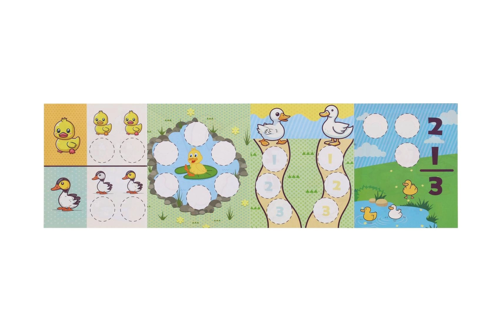 W komplecie znajdują się okrągłe naklejki z motywami kaczuszek oraz tematyczny arkusz do przyklejania i ozdabiania projektów.