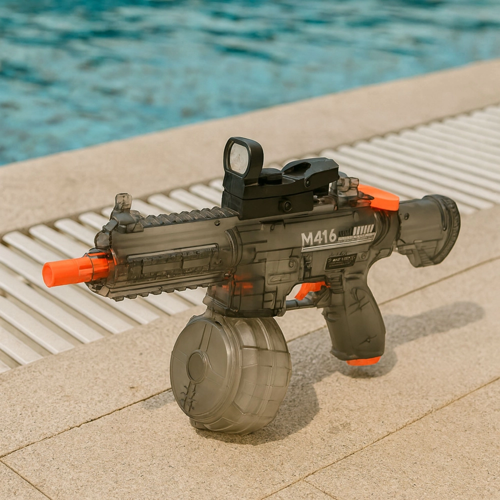 Elektryczny pistolet na wodę M416 to idealny wybór do zabaw na zewnątrz: przy basenie, w ogrodzie i na plaży. Ergonomiczny uchwyt, napęd automatyczny i duży bębnowy zbiornik zapewniają stabilną pracę bez ciągłego pompowania. Przezroczyste korpus z pomarańczowymi elementami bezpieczeństwa wygląda nowocześnie, a efektowne LED przy wylocie lufy dodają akcji dynamiki.