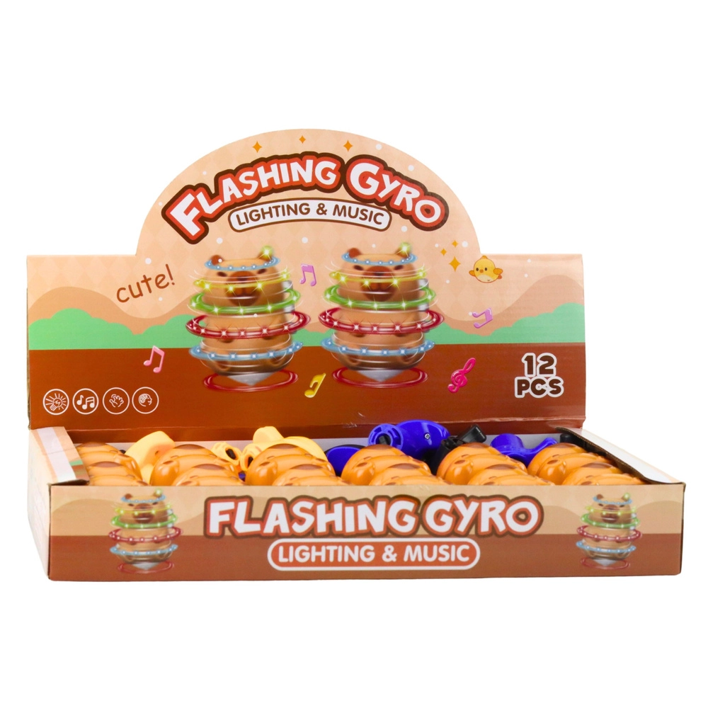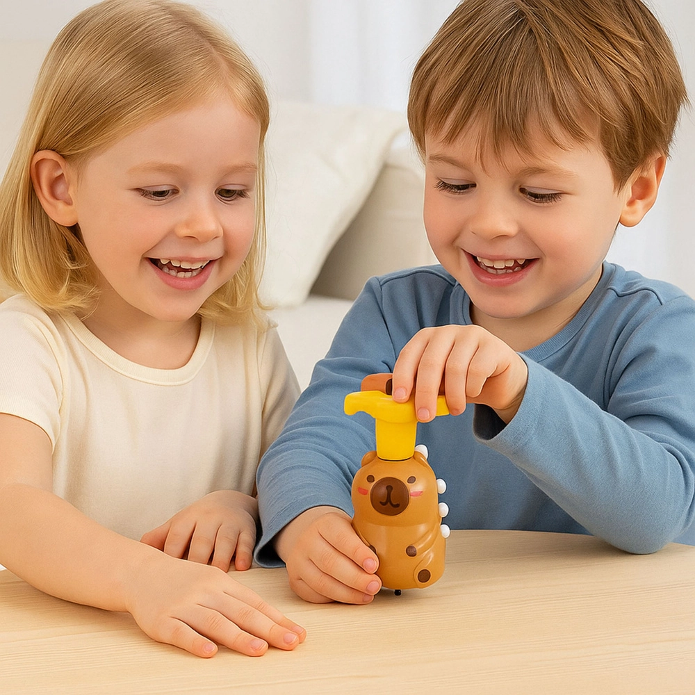 Uroczy interaktywny bączek w kształcie kapibary zapewnia dzieciom mnóstwo zabawy dzięki połączeniu kolorowych świateł LED, radosnych melodii i szybkiego wirowania. Wystarczy pociągnąć za górny uchwyt, a zabawka zacznie się kręcić, zachwyci efektami i wesprze motorykę oraz koordynację.