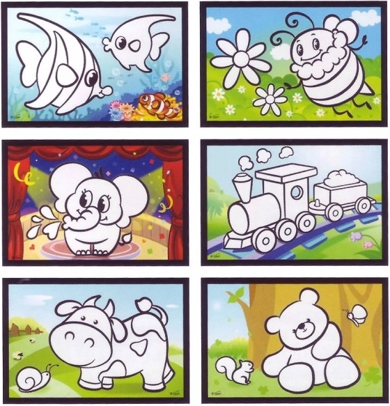 Instrukcja: Otwórz pędzelek, napełnij go wodą i zamknij. Przeciągaj po białych częściach obrazka, aż pięknie się wybarwią. Po kilku minutach obrazek wyschnie i będzie gotowy do kolejnej zabawy.