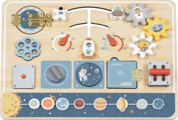 Ta drewniana edukacyjna tablica przenosi dzieci w świat kosmicznych odkryć. Każdy element – od przełączników i dźwigni po obracający się radar – wspiera ciekawość i koncentrację. Dzieci bawią się w sterowanie statkiem kosmicznym, obserwują „przyrządy” i uczą się poprzez dotyk, ruch i powtarzanie.