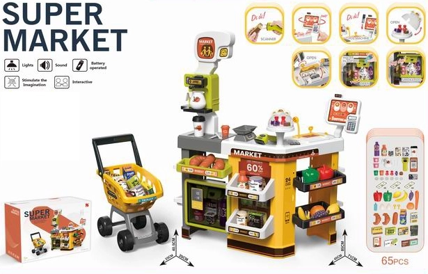 Zestaw zawiera przestronny blat, wózek na zakupy, akcesoria do sprzedaży oraz dekoracyjne produkty spożywcze. Elektroniczna lodówka, terminal płatniczy i ręczny skaner na baterie wspierają interaktywną zabawę i rozwijają wyobraźnię.