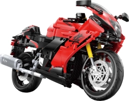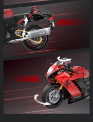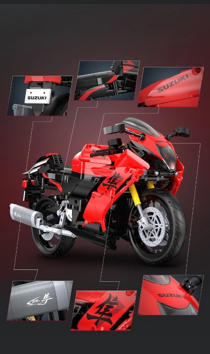 Ta licencjonowana replika legendarnej SUZUKI Hayabusa ucieszy fanów motocykli i miłośników technicznych klocków. Precyzyjne detale, takie jak lusterka, reflektor, owiewki, błotniki i napęd łańcuchowy, uzupełnia działające przednie i tylne zawieszenie oraz skrętna przednia widelica. Po złożeniu model świetnie prezentuje się na dołączonym stojaku z tabliczką.