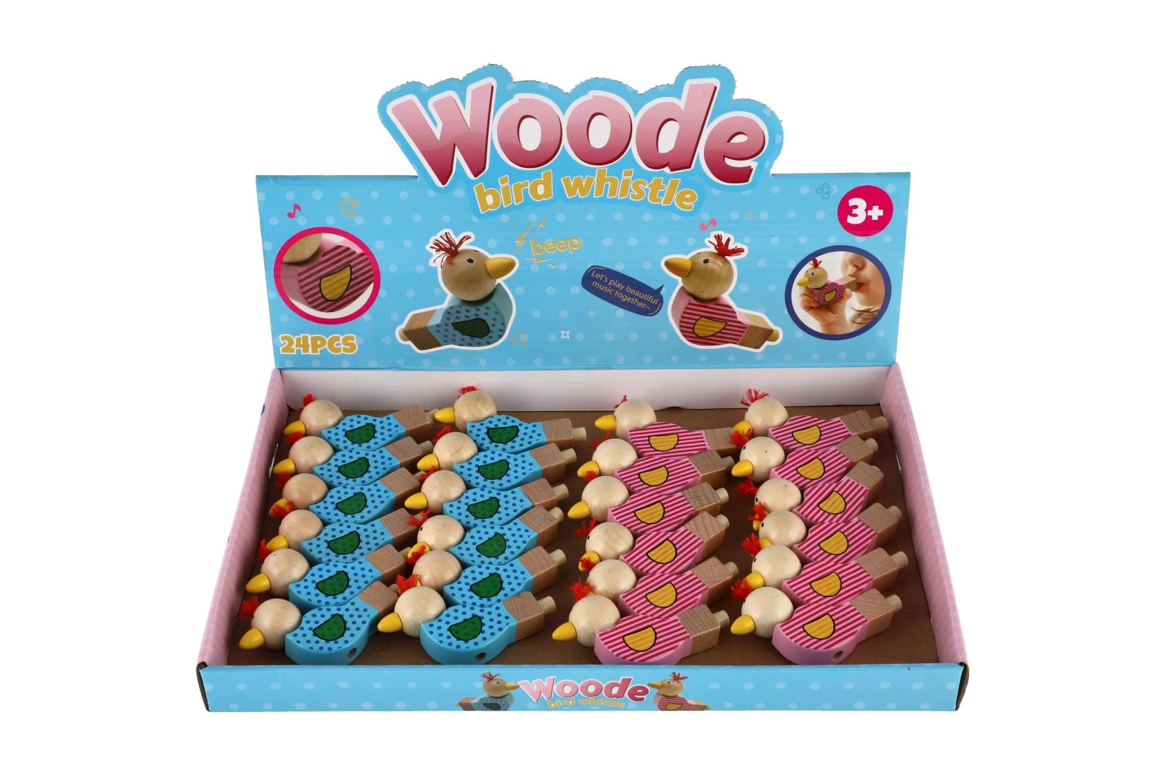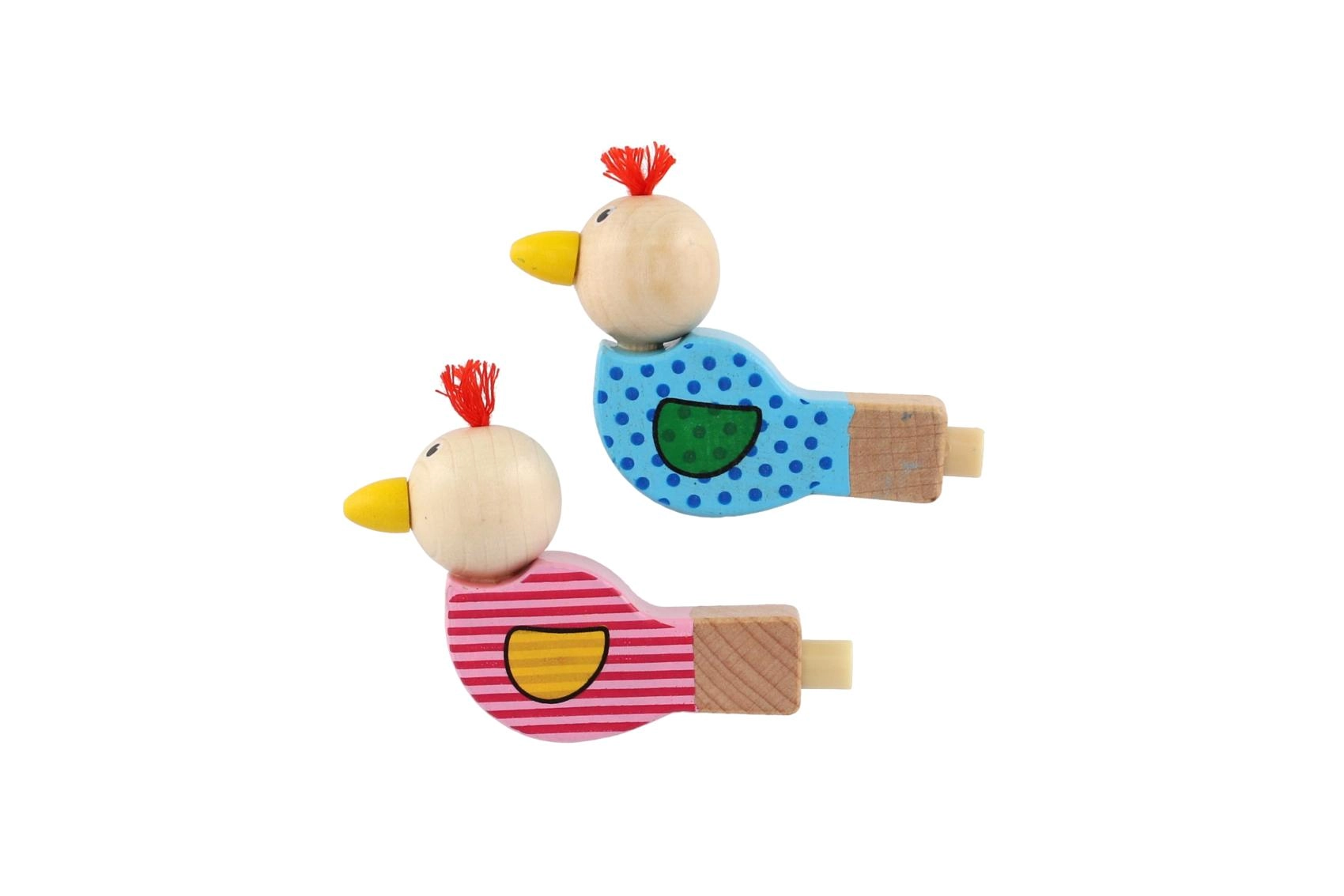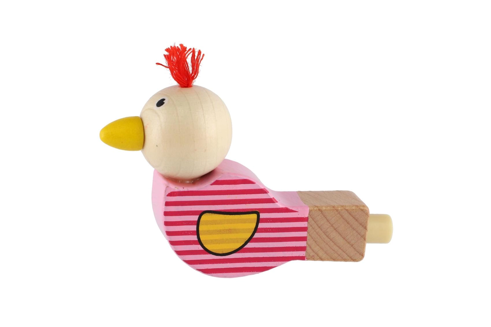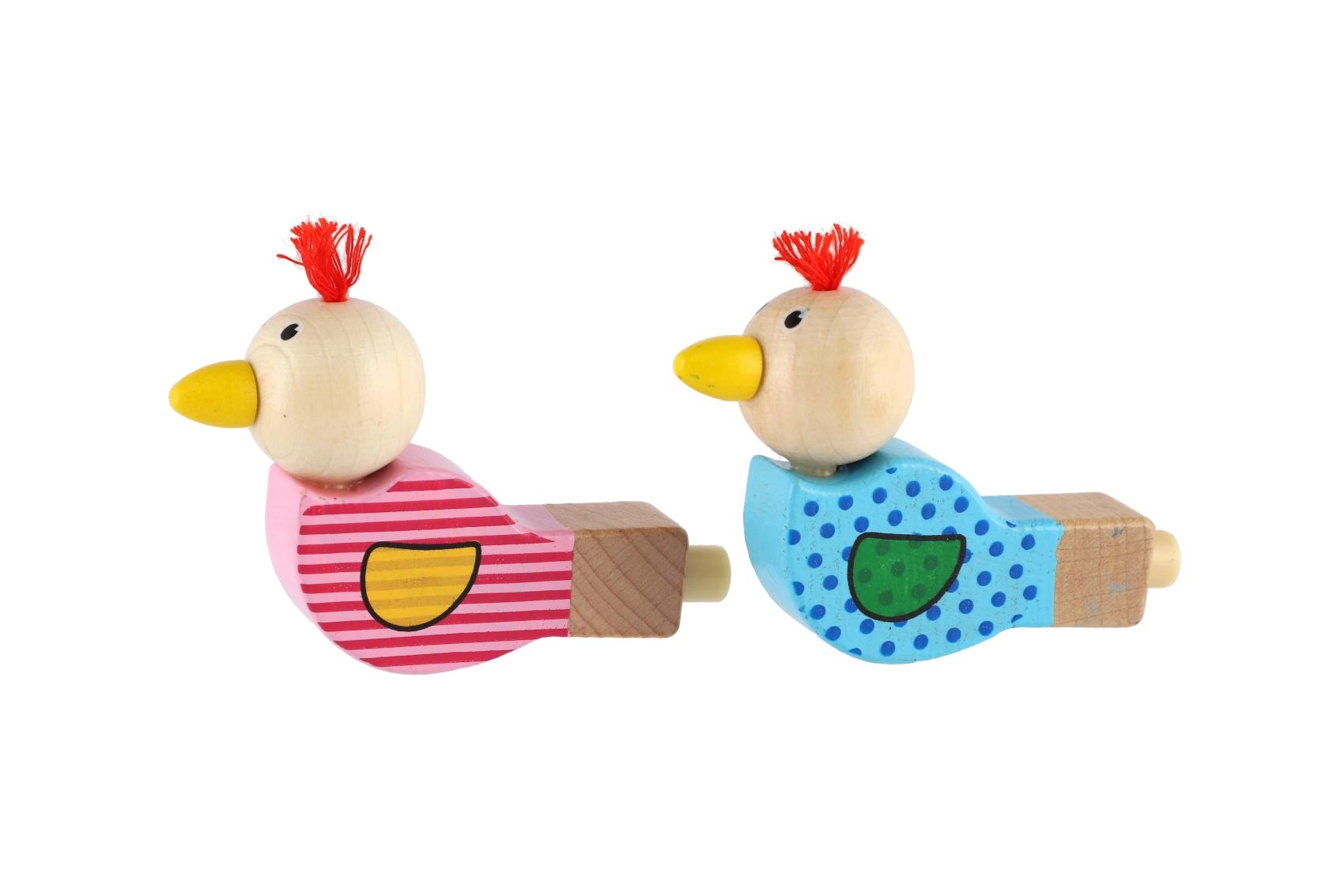 Gwizdek wykonano z wysokiej jakości drewna i ozdobiono wesołymi motywami w wariancie różowym i niebieskim. Mały frędzelek na głowie ptaszka nadaje zabawce charakteru. Doskonały jako drobny prezent, nagroda lub dodatek do dziecięcej torebki na przyjęcie.