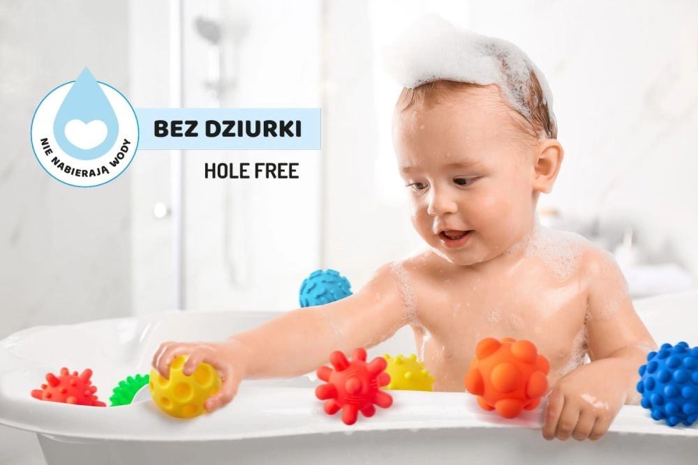 Każda piłka ma inną strukturę i średnicę w zakresie ok. 59–77 mm, aby dziecko mogło stopniowo uczyć się chwytania przedmiotów o różnych rozmiarach. Konstrukcja bez otworów zapobiega gromadzeniu się wody i zanieczyszczeń, dlatego piłki są idealne także do kąpieli. Spełniają europejskie normy i zapewniają bezpieczną, bogatą sensorycznie zabawę w domu i w podróży.