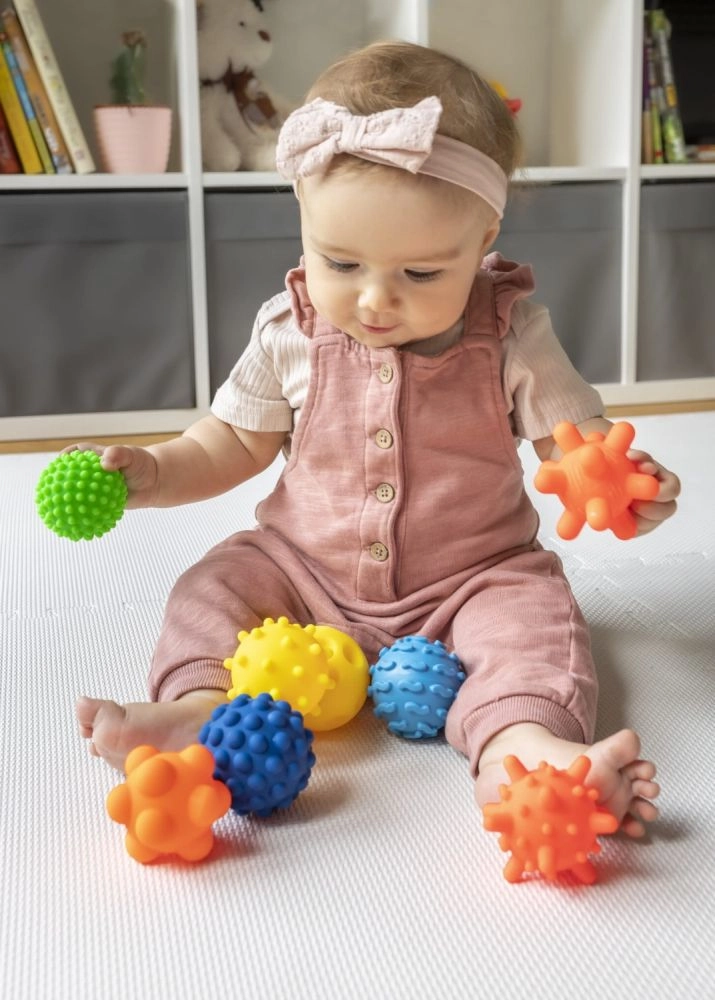 Każda piłka oferuje inną powierzchnię – kolce, wypustki i rowki dla intensywnej stymulacji dotykowej i radości z odkrywania.