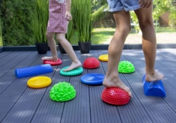 Wypustki i rowki przyjemnie masują stopy i aktywują zmysły, co sprzyja treningowi propriocepcji.