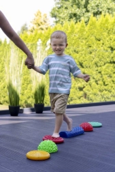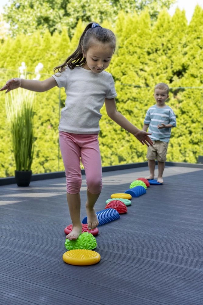 Zestaw sześciu kolorowych elementów z wypustkami i rowkami został zaprojektowany do chodzenia boso, treningu stabilności i rozwoju motoryki dużej. Antypoślizgowe faktury zwiększają pewność kroku i naturalnie aktywują mięśnie stóp, kostek oraz centrum ciała. Dzięki modułowej budowie można tworzyć prostą ścieżkę, slalom lub tor przeszkód.