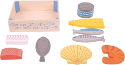 Ta drewniana skrzynka jest pełna świeżych i zdrowych ryb, takich jak łosoś, puszka tuńczyka i krewetka. Świetny dodatek do drewnianej kuchni dla wszystkich małych kucharzy. Bigjigs Toys drewniane jedzenie wspiera angażującą naukę o pochodzeniu i przygotowaniu jedzenia, poprawia motorykę dzieci i jednocześnie bawi.