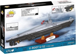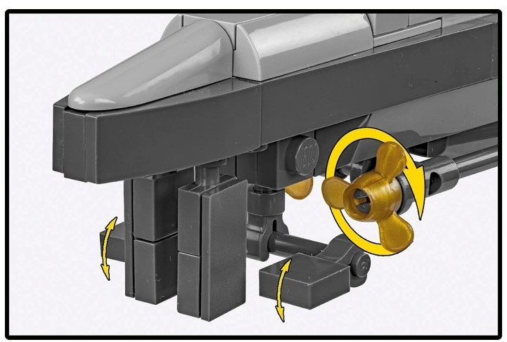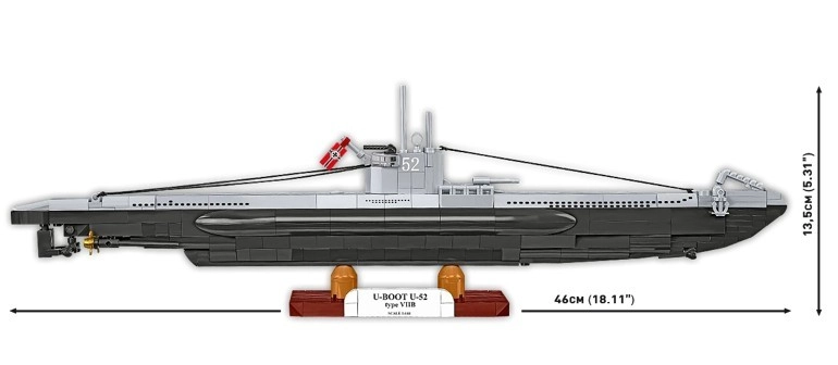 W zestawie znajdują się obrotowe śruby okrętowe oraz stabilna podstawka z tabliczką U-52, która podkreśla kolekcjonerski charakter modelu.