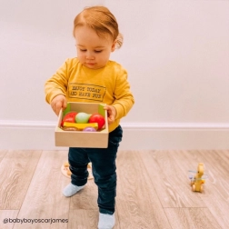 Po zakończeniu zabawy owoce można łatwo schować z powrotem do skrzynki, która jest zabezpieczona przesuwnym wiekiem. Ta drewniana zabawka wykonana jest z wysokiej jakości i odpowiedzialnie pozyskiwanych materiałów, które spełniają obecne europejskie normy bezpieczeństwa.