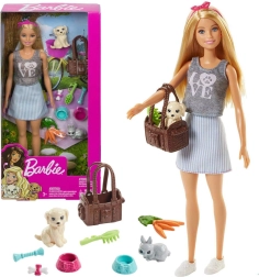 - Lalka BARBIE, figurka pieska, figurka króliczka, przenośna torba, 6 akcesoriów (miski, kosteczka, szczotka, marchewki itp.)