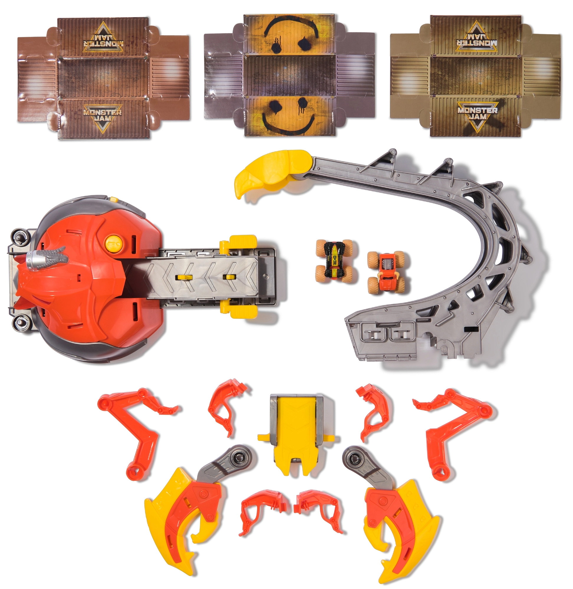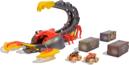 Przemyślana i bezpieczna konstrukcja chroni przed niepożądanym wystrzałem – napęd automatycznie zatrzymuje się po uniesieniu. Po zabawie cały zestaw zamienia się w pojemnik na nawet 12 mini trucków, więc wszystko będzie gotowe na kolejną akcję. W komplecie dwa metalowe mini modele EL TORO LOCO i MAX-D z autentycznymi detalami.