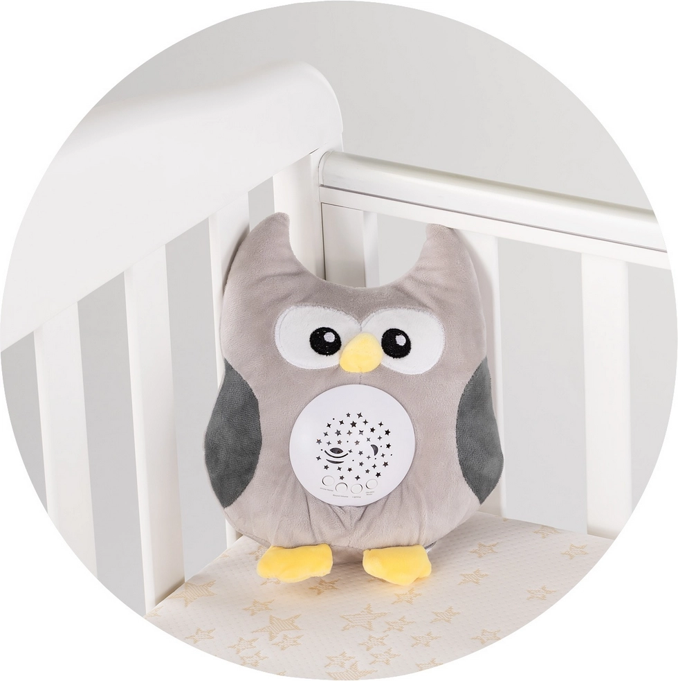 Przemień pokój dziecięcy w bezpieczne i przytulne miejsce do snu. Pluszowa sowa Chipolino delikatnie wyświetla gwiazdki i księżyce w kolorach RGB i towarzyszy dziecku kojącymi dźwiękami – od kołysanek po biały szum przypominający łono matki lub odgłosy natury. Proste sterowanie obsłużysz nawet po ciemku.