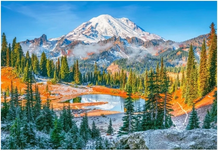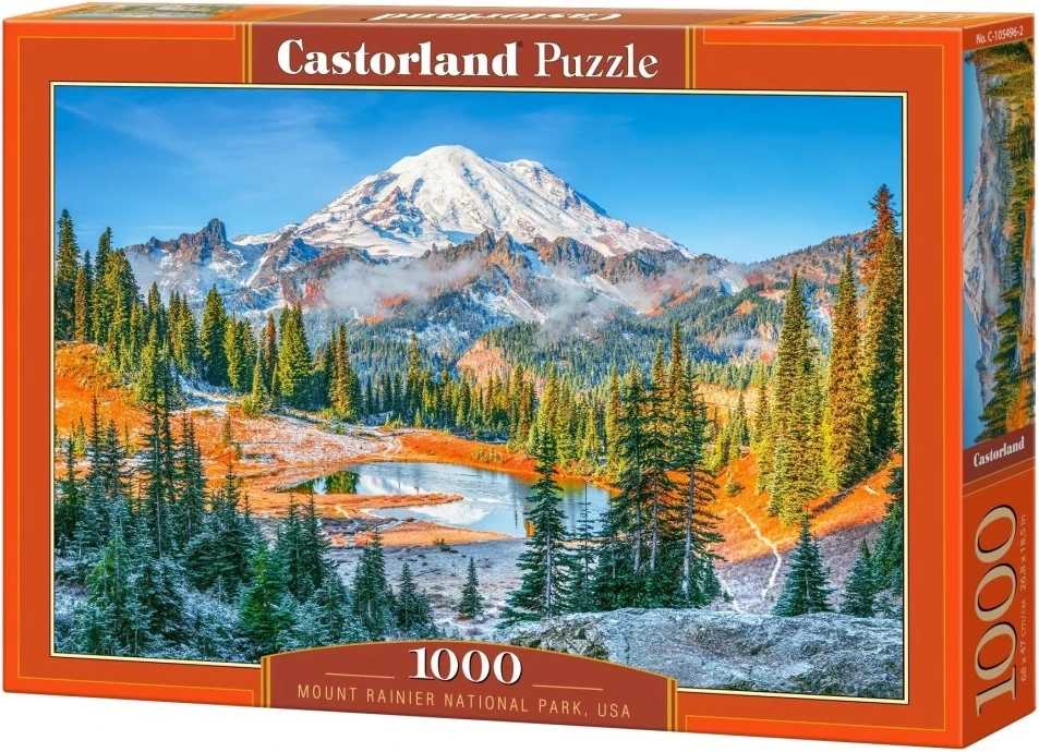 Odkryj urok majestatycznej natury dzięki puzzle, które uchwyca piękno Mount Rainier. Dzięki 1000 precyzyjnie wyciętym elementom czeka Cię świetna zabawa i relaks, a gotowy obraz doskonale zaprezentuje się na ścianie lub pod szkłem.