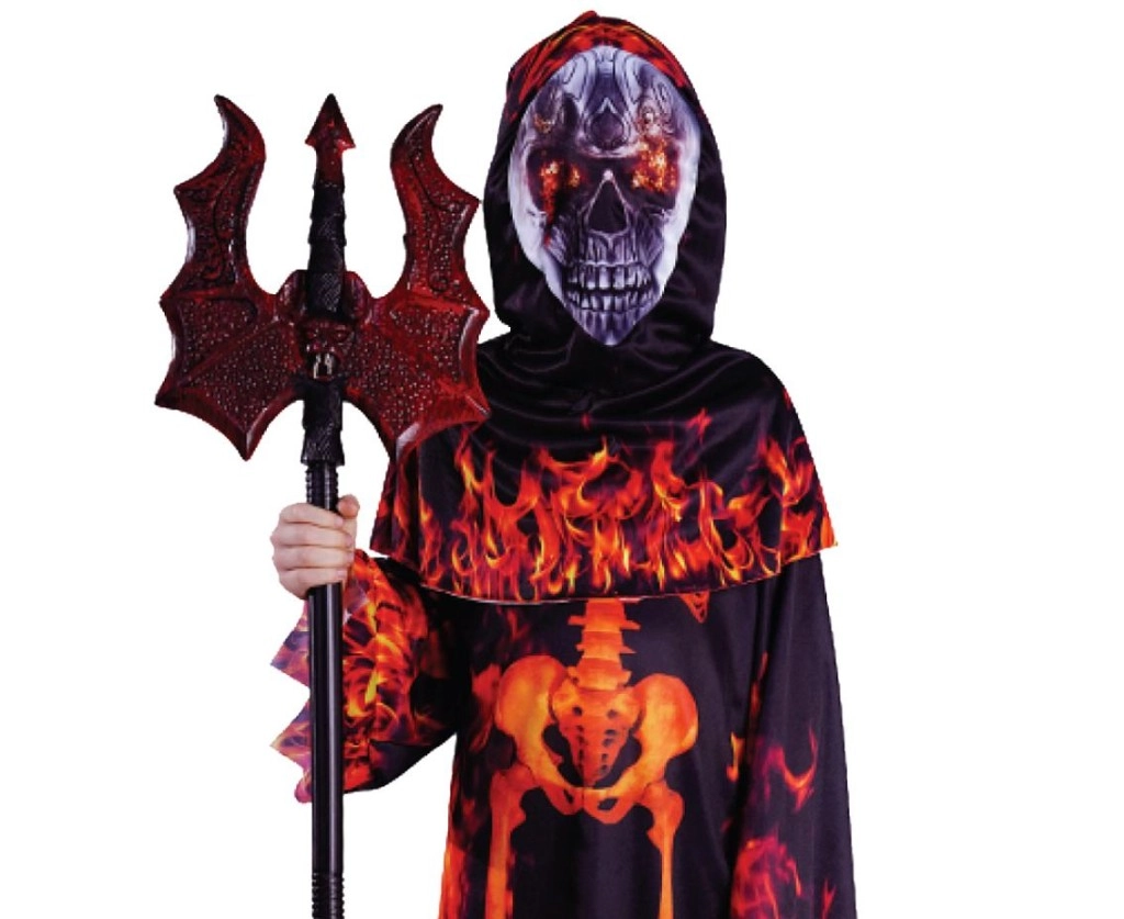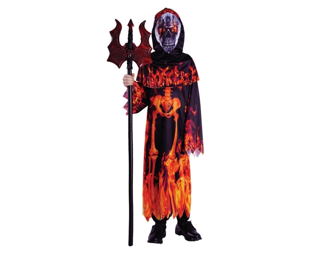 Stylowy dziecięcy kostium diabła z kapturem w uniwersalnym rozmiarze 110–120 cm to świetny wybór na wszystkie straszne wydarzenia. Długi płaszcz z kapturem zdobią wyraziste płomienie i motyw kościotrupa, które tworzą efektowny, a jednocześnie przyjazny dla dzieci wygląd.