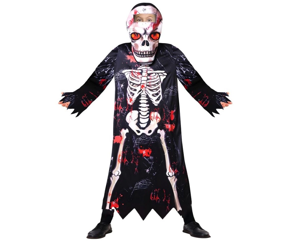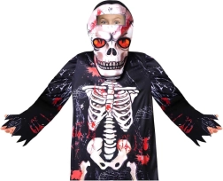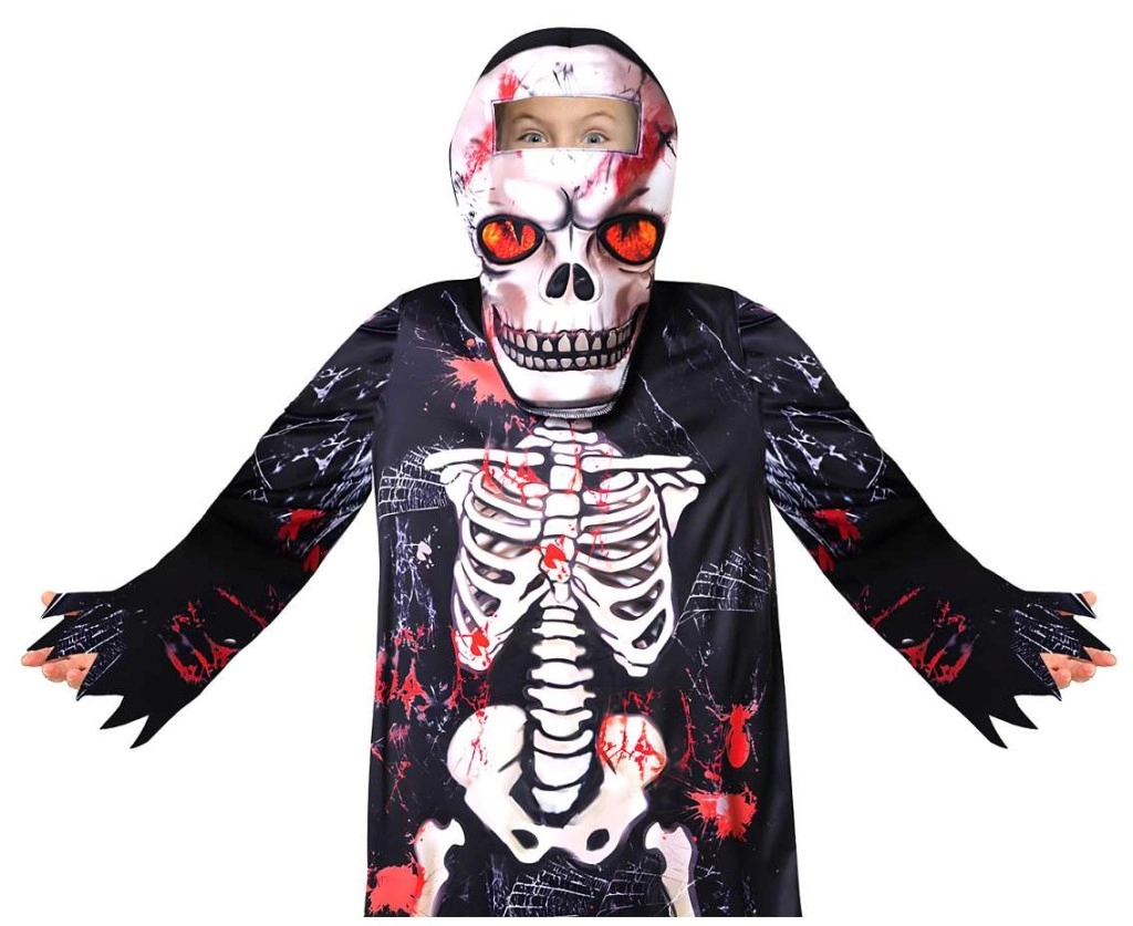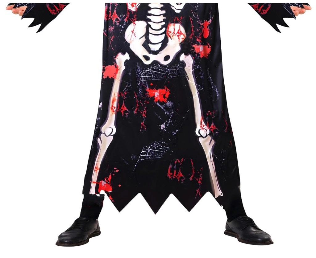 Dzięki lekkiemu materiałowi kostium wygodnie się nosi i umożliwia swobodę ruchów podczas zabawy i tańca. Wyrazisty kontrastowy nadruk kości z czerwonymi akcentami doda dziecku strasznego, a jednocześnie zabawnego looku bez skomplikowanego makijażu.