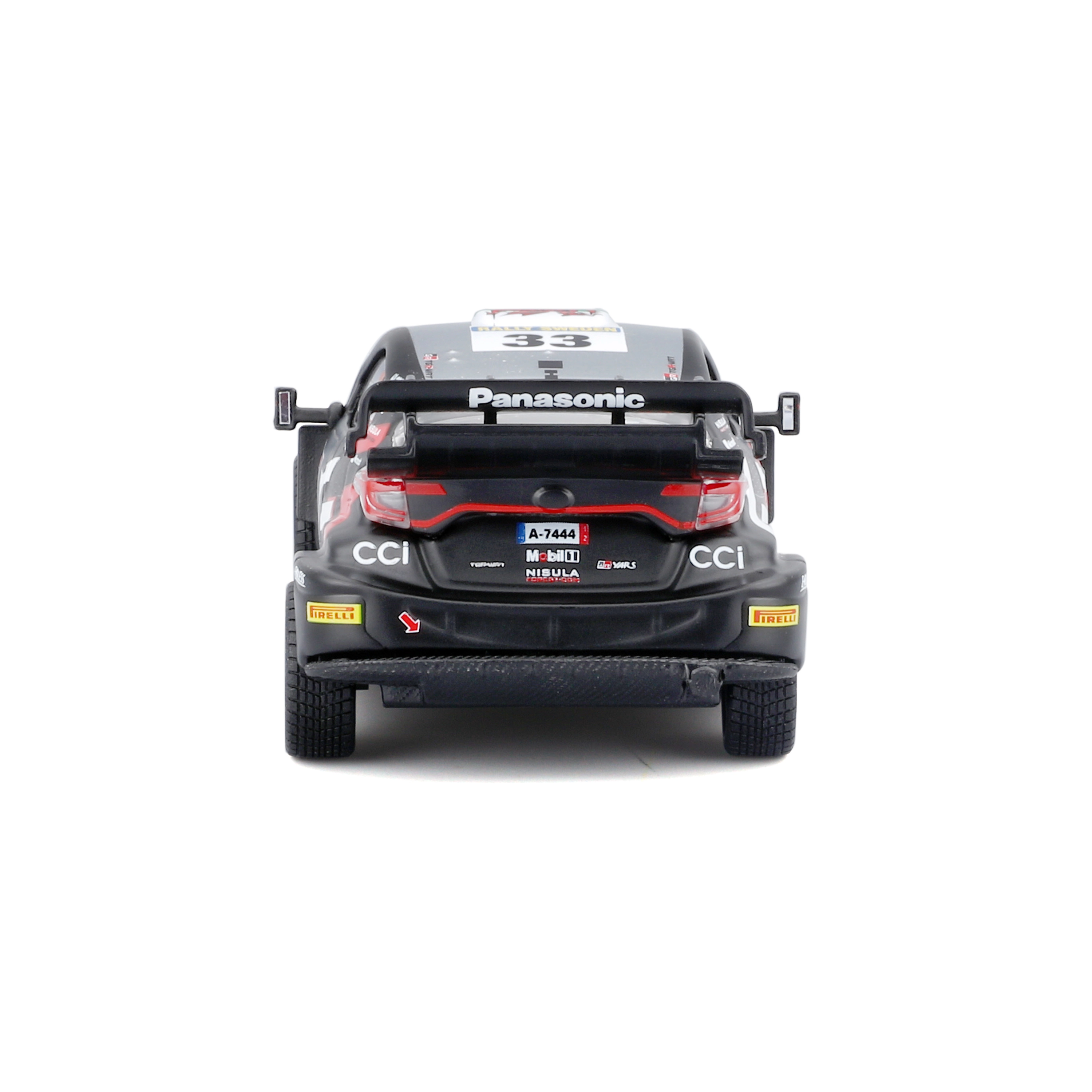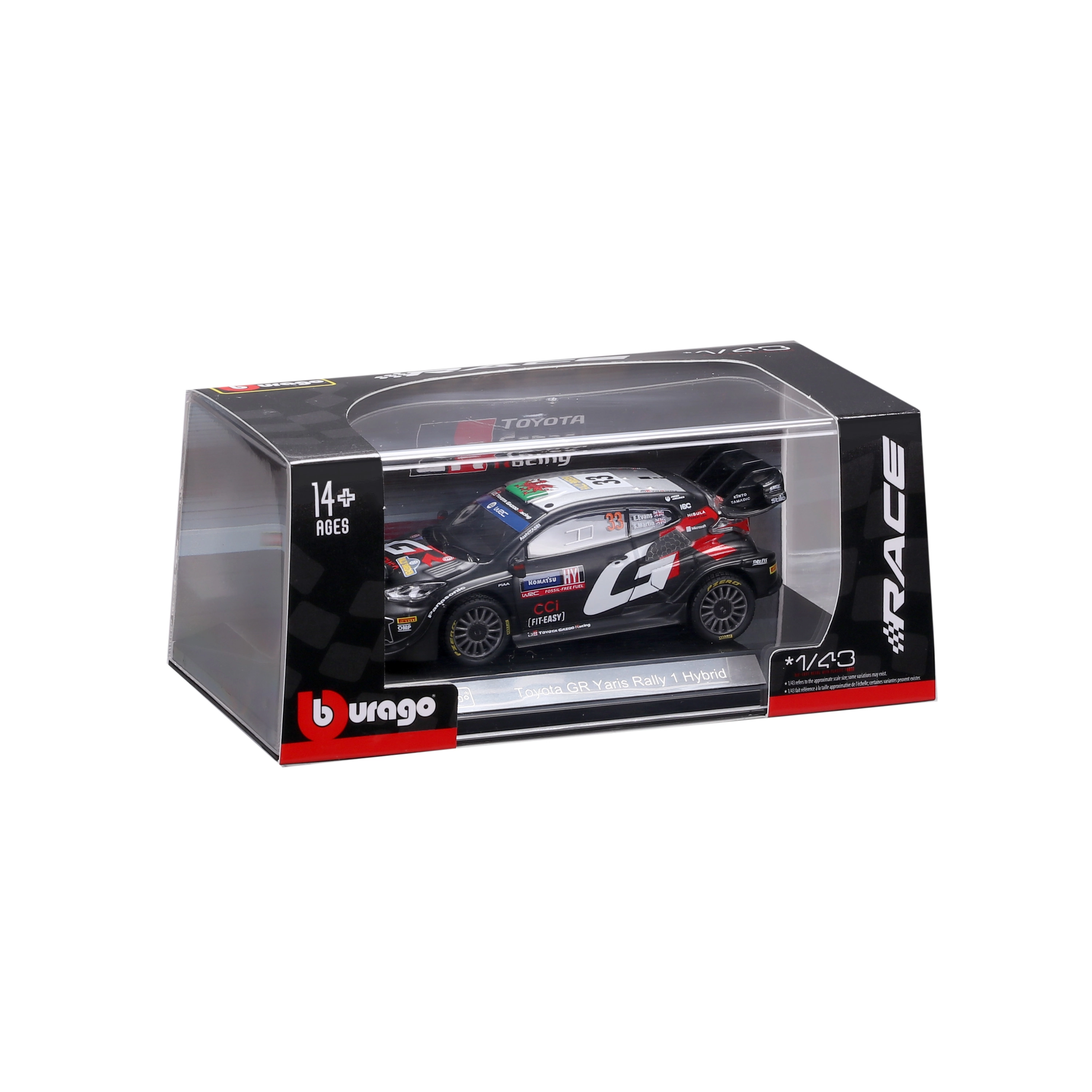 Zbierz kultowy samochód WRC z modelem Bburago 1:43 Toyota GR Yaris Rally1 Hybrid #33 (Evans). Precyzyjne metalowe wykonanie, autentyczne wyścigowe oznakowanie, szczegółowa aerodynamika oraz swobodnie obracające się koła sprawiają, że to świetny eksponat na półkę i do lekkiej zabawy. Dostarczany w pudełku prezentowym – idealny prezent dla fanów rajdów i kolekcjonerów.