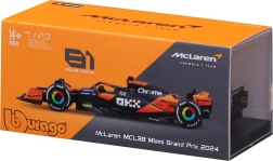 Przezroczysta osłona na czarnej podstawce z opisem „McLaren MCL38 - Miami Grand Prix 2024” chroni model przed kurzem i umożliwia oglądanie ze wszystkich stron.