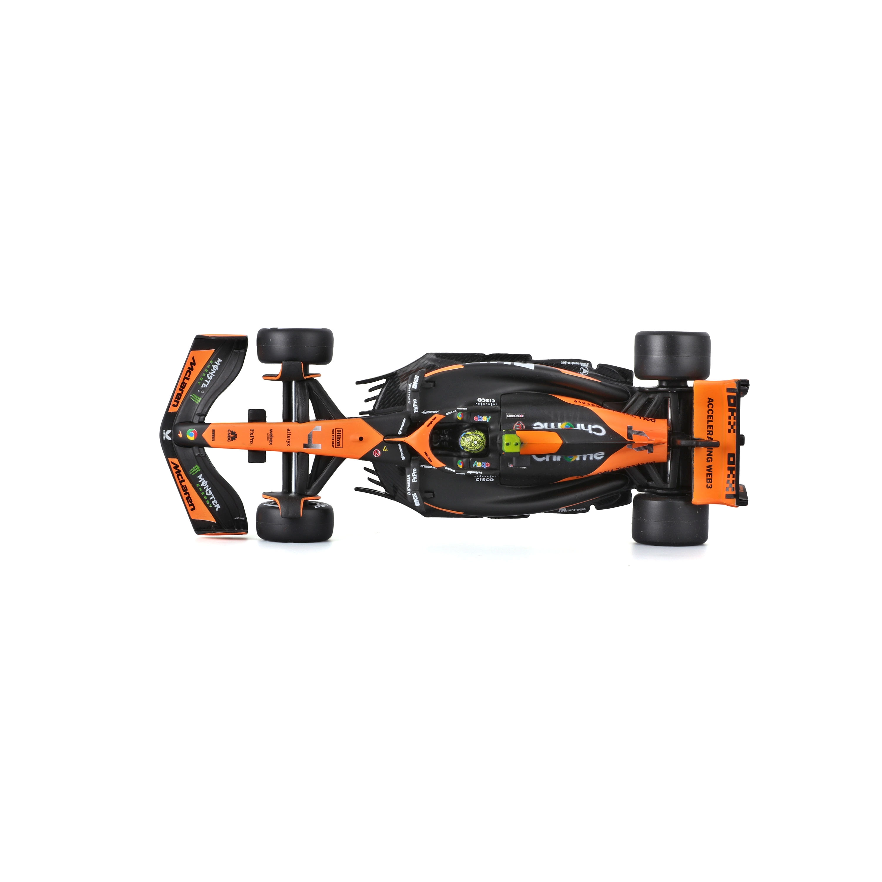 Detale w pomarańczowo‑czarnych barwach, logotypy sponsorów i numer 4 – wszystko zgodne z prawdziwym bolidem Lando Norrisa z sezonu 2024.