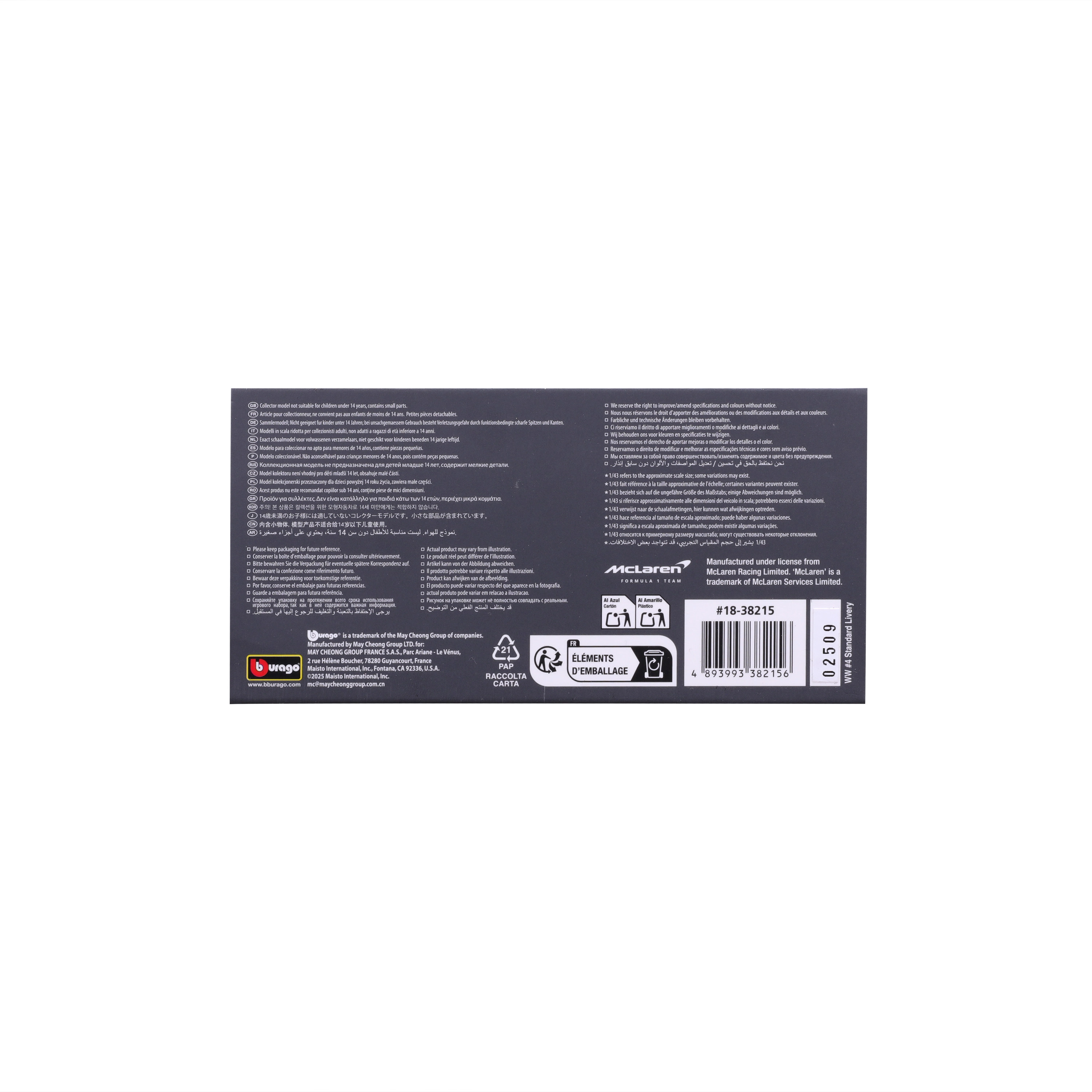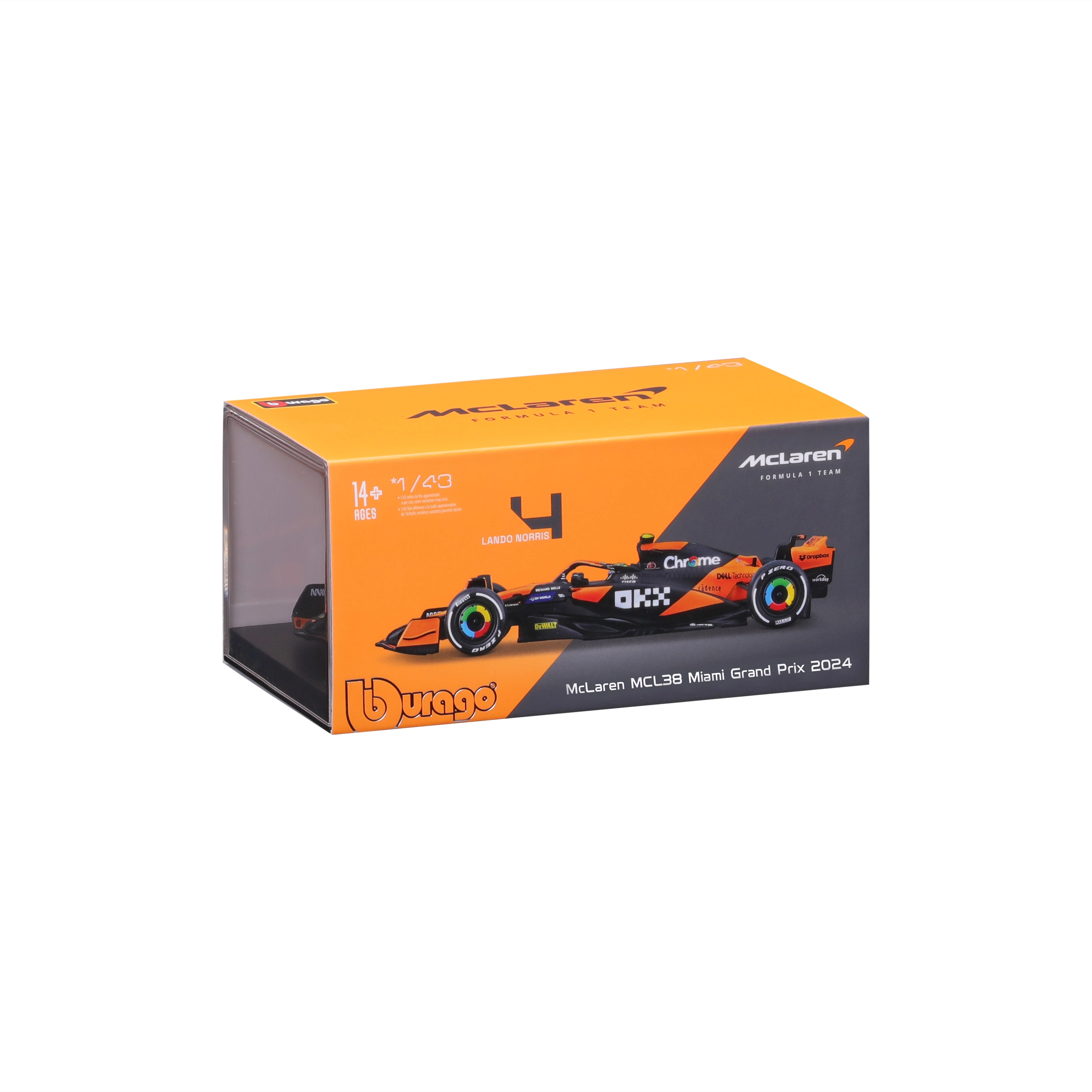 Oficjalnie licencjonowany model McLaren MCL38 2024 w skali 1:43 od Bburago odwzorowuje aktualny bolid Lando Norrisa z ikonicznym pomarańczowo‑czarnym malowaniem i logotypami sponsorów. Dzięki precyzyjnym proporcjom, kształtom aerodynamicznym oraz szczegółowemu kokpitowi z figurką kierowcy doskonale nadaje się do gabloty i jako prezent dla fanów Formuły 1.